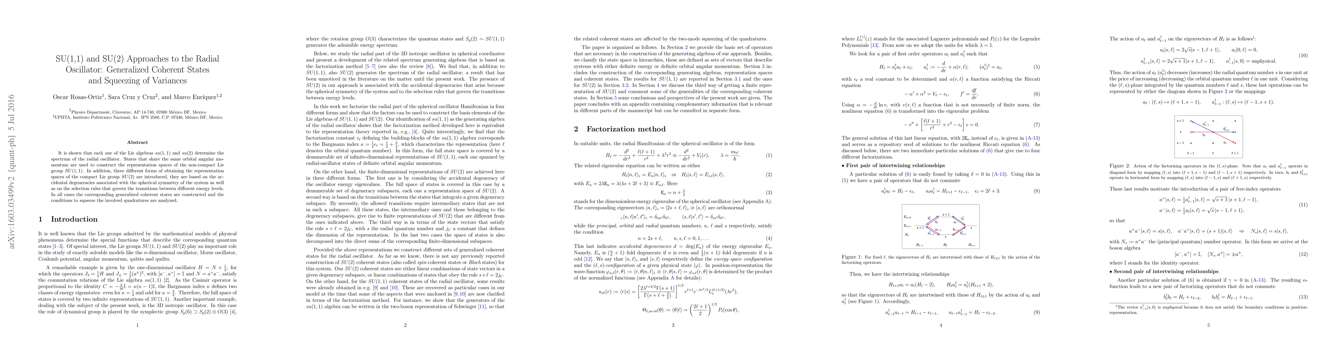 This paper explores the application of the Lie algebras su(1,1) and su(2) to the radial oscillator, constructing generalized coherent states and analyzing squeezing conditions. It introduces representation spaces for the non-compact SU(1,1) and three methods for the compact SU(2), all based on the system's spherical symmetry and transition selection rules.