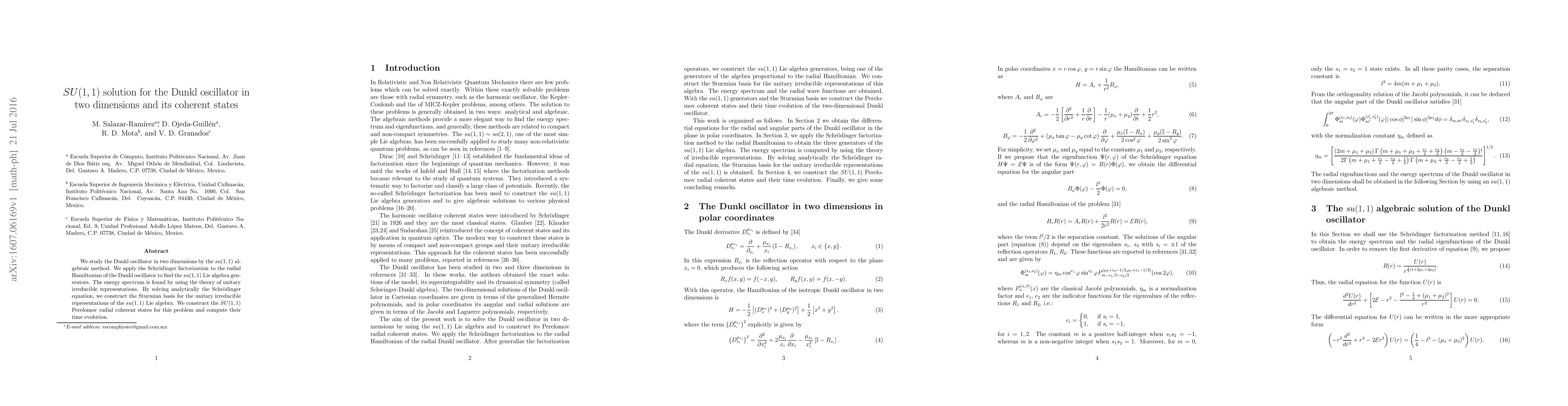 We study the Dunkl oscillator in two dimensions by the $su(1,1)$ algebraic method. We apply the Schr\"odinger factorization to the radial Hamiltonian of the Dunkl oscillator to find the $su(1,1)$ Lie algebra generators. The energy spectrum is found by using the theory of unitary irreducible representations. By solving analytically the Schr\"odinger equation, we construct the Sturmian basis for the unitary irreducible representations of the $su(1,1)$ Lie algebra. We construct the $SU(1,1)$ Perelomov radial coherent states for this problem and compute their time evolution.