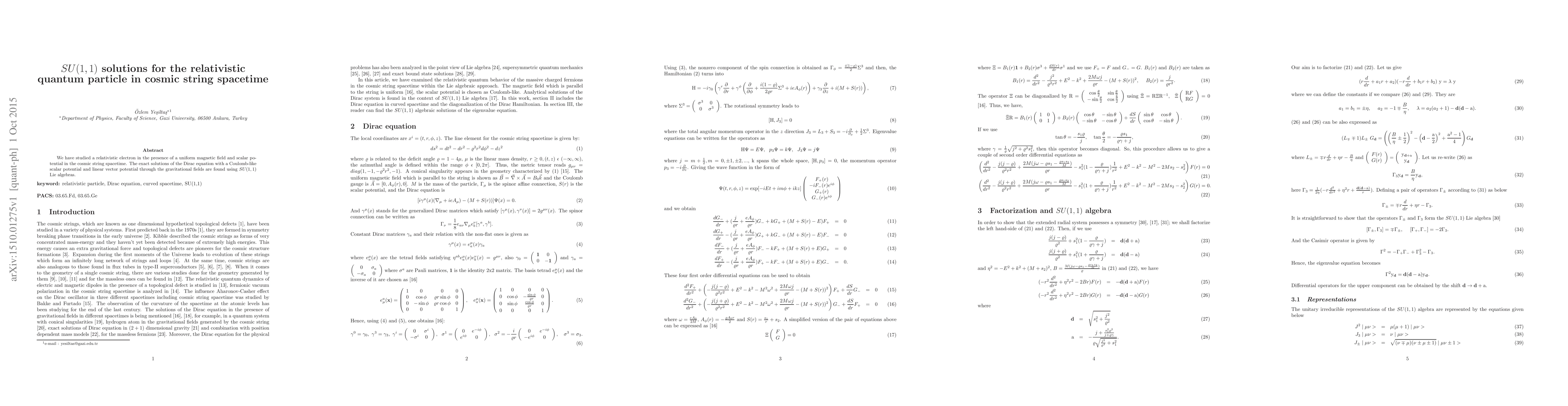 Summary: This paper explores the relativistic quantum dynamics of an electron in cosmic string spacetime under a uniform magnetic field and scalar potential. Exact solutions to the Dirac equation are derived using SU(1,1) Lie algebra techniques, revealing the influence of gravitational fields.