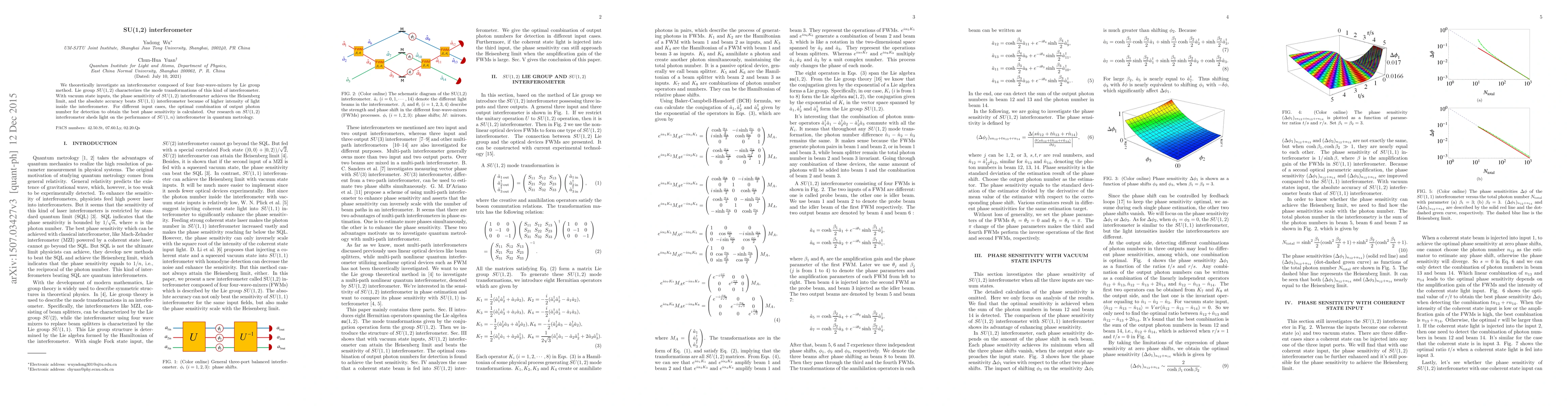 We theoretically investigate an interferometer composed of four four-wave-mixers by Lie group method. Lie group SU(1,2) characterizes the mode transformations of this kind of interferometer. With vacuum state inputs, the phase sensitivity of SU(1,2) interferometer achieves the Heisenberg limit, and the absolute accuracy beats SU(1,1) interferometer because of higher intensity of light inside the interferometer. For different input cases, the optimal combination of output photon number for detection to obtain the best phase sensitivity is calculated. Our research on SU(1,2) interferometer sheds light on the performance of SU(1,n) interferometer in quantum metrology.