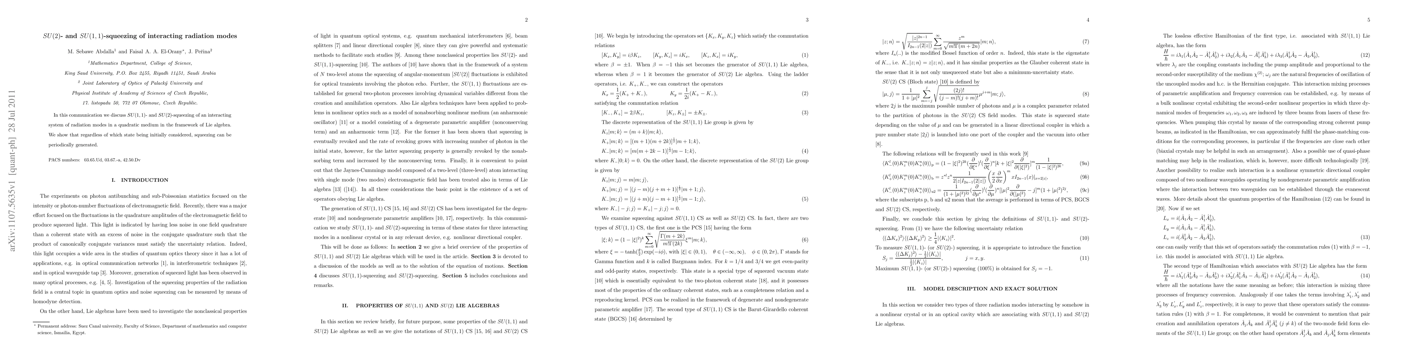 In this communication we discuss SU(1,1)- and SU(2)-squeezing of an interacting system of radiation modes in a quadratic medium in the framework of Lie algebra. We show that regardless of which state being initially considered, squeezing can be periodically generated.