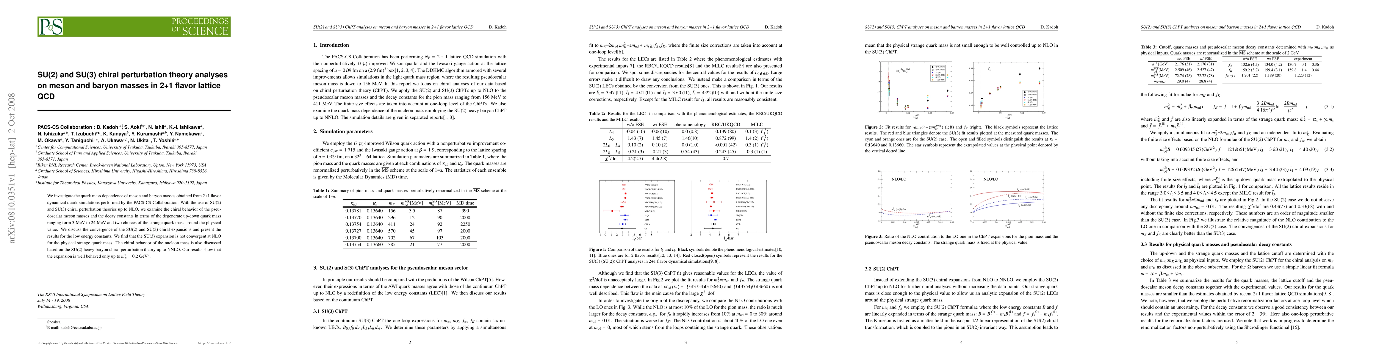 This paper analyzes meson and baryon masses from 2+1 flavor lattice QCD simulations using SU(2) and SU(3) chiral perturbation theories. The study finds that while SU(2) expansions are well-behaved, the SU(3) expansion fails at NLO for the physical strange quark mass, and the nucleon mass shows convergence only up to m_pi^2 ~ 0.2 GeV^2.