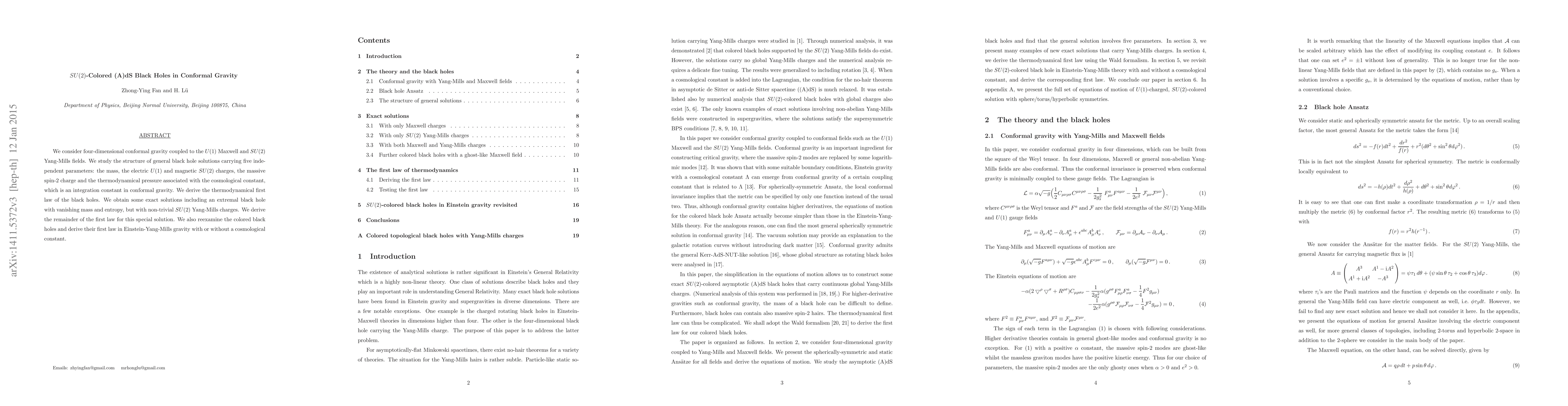 The paper derives the first law of thermodynamics for SU(2)-colored black holes in conformal gravity, presenting exact solutions with unusual properties and expanding the understanding of colored black hole physics.