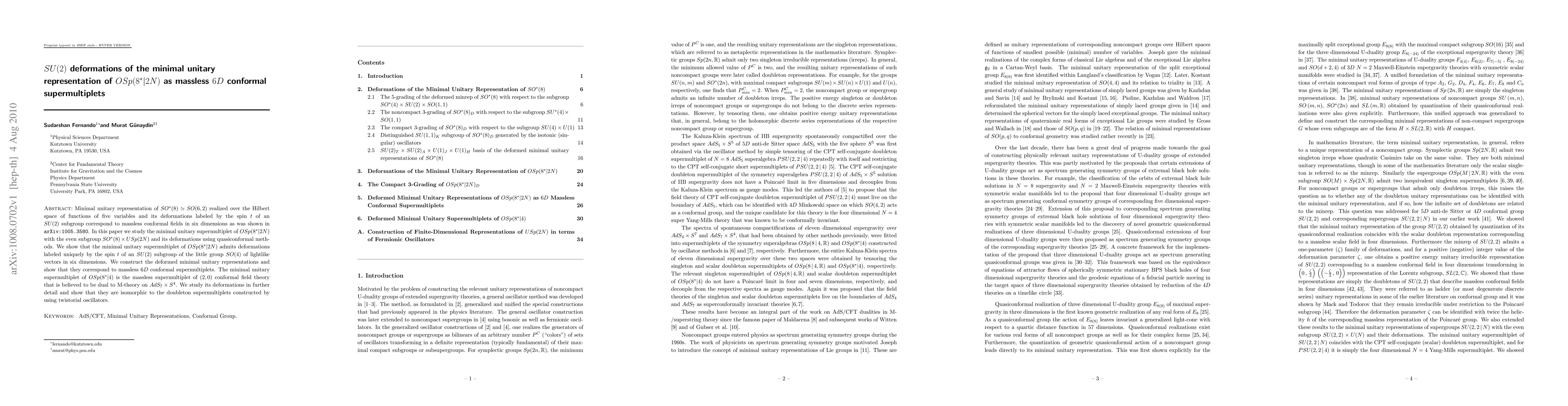This paper investigates the minimal unitary supermultiplet of OSp(8*|2N), demonstrating its SU(2) deformations corresponding to massless 6D conformal supermultiplets, and particularly focuses on the OSp(8*|4) supermultiplet, which is dual to M-theory on AdS_7 x S^4, showing its deformations align with twistorial oscillator-based doubleton supermultiplets.