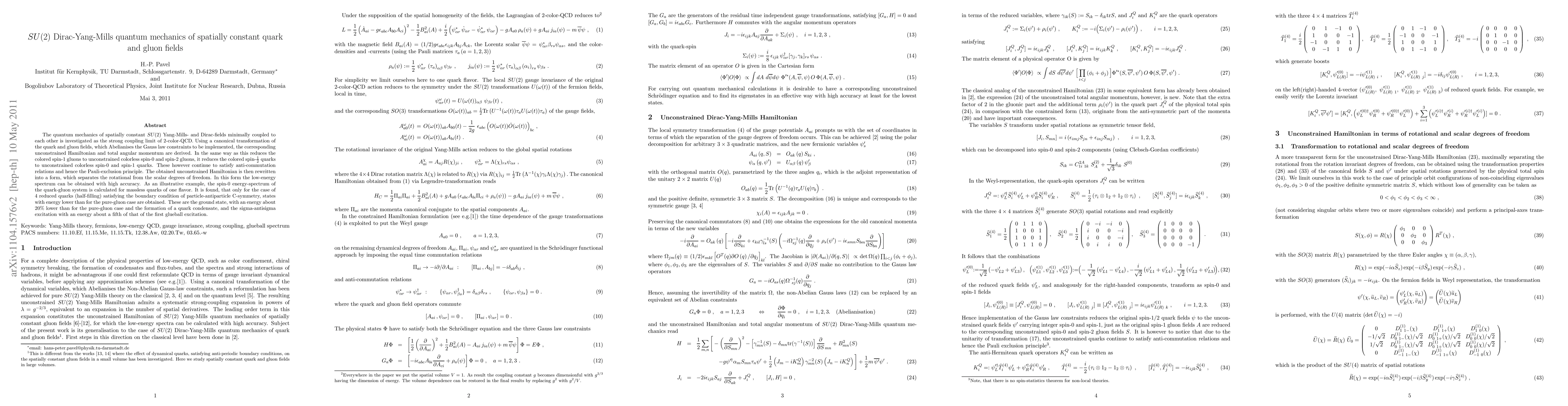 This paper investigates the quantum mechanics of spatially constant SU(2) Yang-Mills and Dirac fields in the strong coupling limit of 2-color QCD. The study derives an unconstrained Hamiltonian and total angular momentum through a canonical transformation, revealing reduced quark and gluon states with distinct energy spectra.