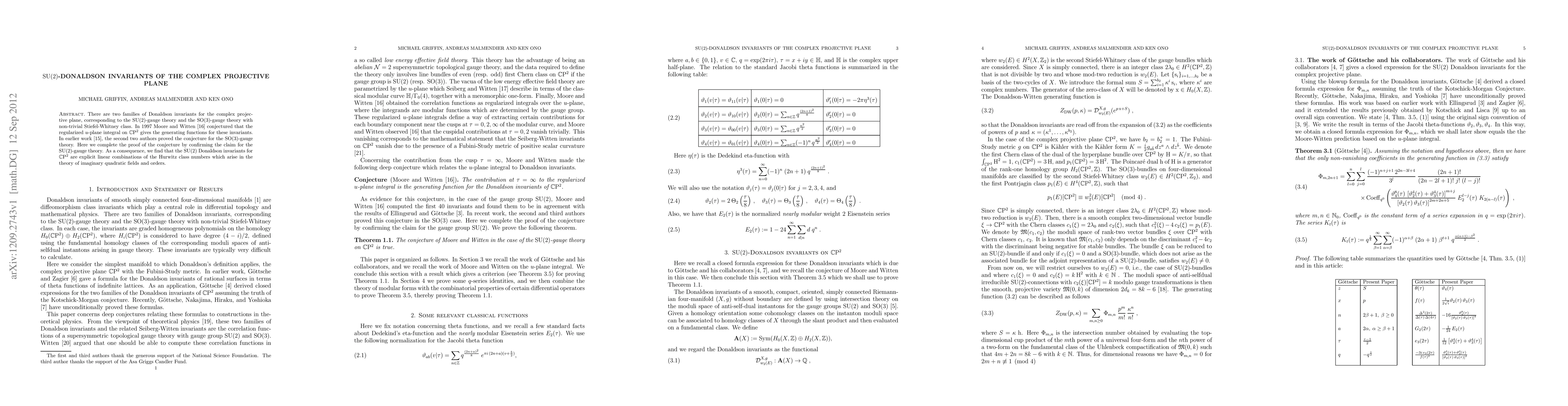 This paper confirms the conjecture by Moore and Witten regarding the generating functions for SU(2)-Donaldson invariants on the complex projective plane, completing the proof for both SU(2) and SO(3) gauge theories. The SU(2) invariants are shown to be linear combinations of Hurwitz class numbers related to imaginary quadratic fields and orders.