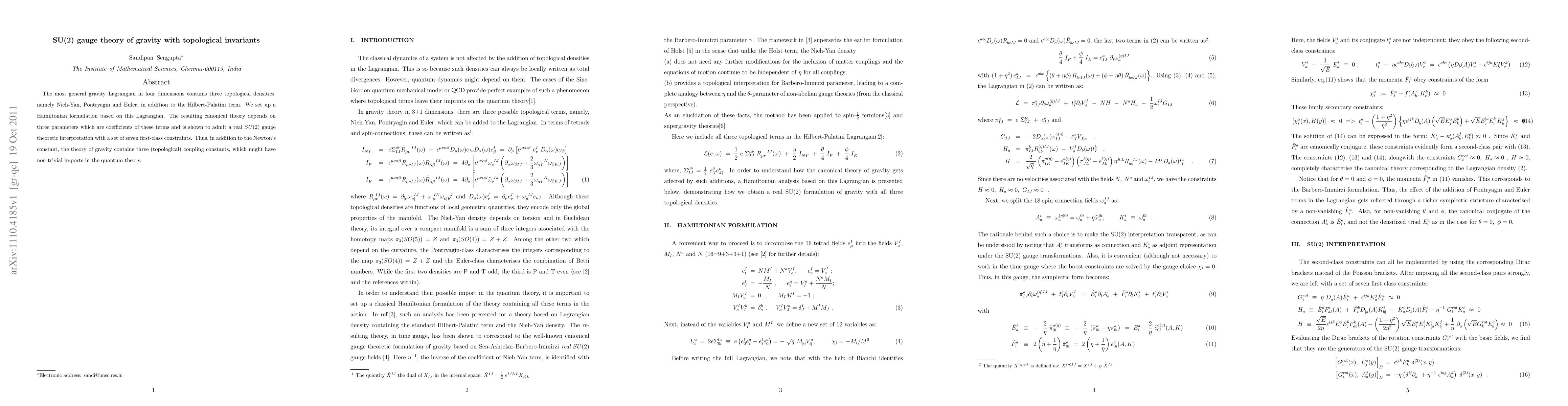 The most general gravity Lagrangian in four dimensions contains three topological densities, namely Nieh-Yan, Pontryagin and Euler, in addition to the Hilbert-Palatini term. We set up a Hamiltonian formulation based on this Lagrangian. The resulting canonical theory depends on three parameters which are coefficients of these terms and is shown to admit a real SU(2) gauge theoretic interpretation with a set of seven first-class constraints. Thus, in addition to the Newton's constant, the theory of gravity contains three (topological) coupling constants, which might have non-trivial imports in the quantum theory.