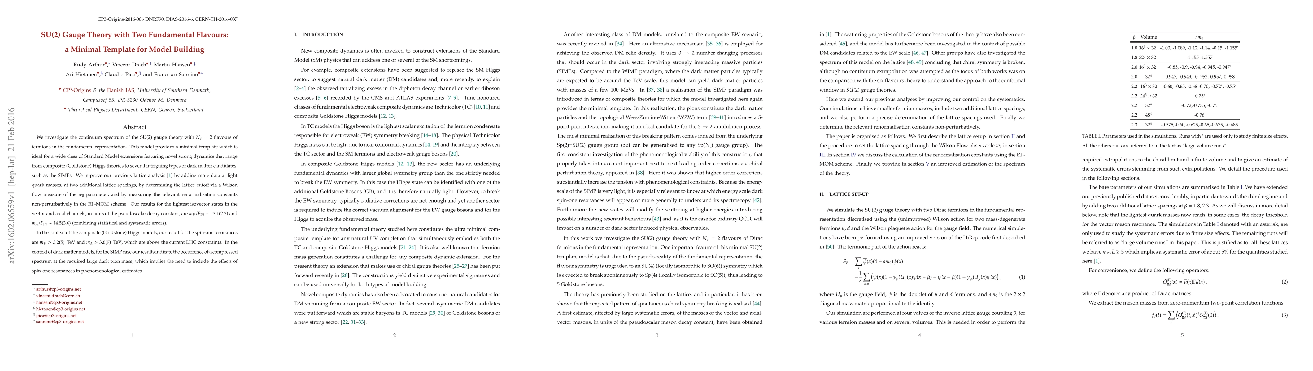 We investigate the continuum spectrum of the SU(2) gauge theory with $N_f=2$ flavours of fermions in the fundamental representation. This model provides a minimal template which is ideal for a wide class of Standard Model extensions featuring novel strong dynamics that range from composite (Goldstone) Higgs theories to several intriguing types of dark matter candidates, such as the SIMPs. We improve our previous lattice analysis [1] by adding more data at light quark masses, at two additional lattice spacings, by determining the lattice cutoff via a Wilson flow measure of the $w_0$ parameter, and by measuring the relevant renormalisation constants non-perturbatively in the RI'-MOM scheme. Our results for the lightest isovector states in the vector and axial channels, in units of the pseudoscalar decay constant, are $m_V/F_{\rm{PS}}\sim 13.1(2.2)$ and $m_A/F_{\rm{PS}}\sim 14.5(3.6)$ (combining statistical and systematic errors). In the context of the composite (Goldstone) Higgs models, our result for the spin-one resonances are $m_V > 3.2(5)$ TeV and $m_A > 3.6(9)$ TeV, which are above the current LHC constraints. In the context of dark matter models, for the SIMP case our results indicate the occurrence of a compressed spectrum at the required large dark pion mass, which implies the need to include the effects of spin-one resonances in phenomenological estimates.