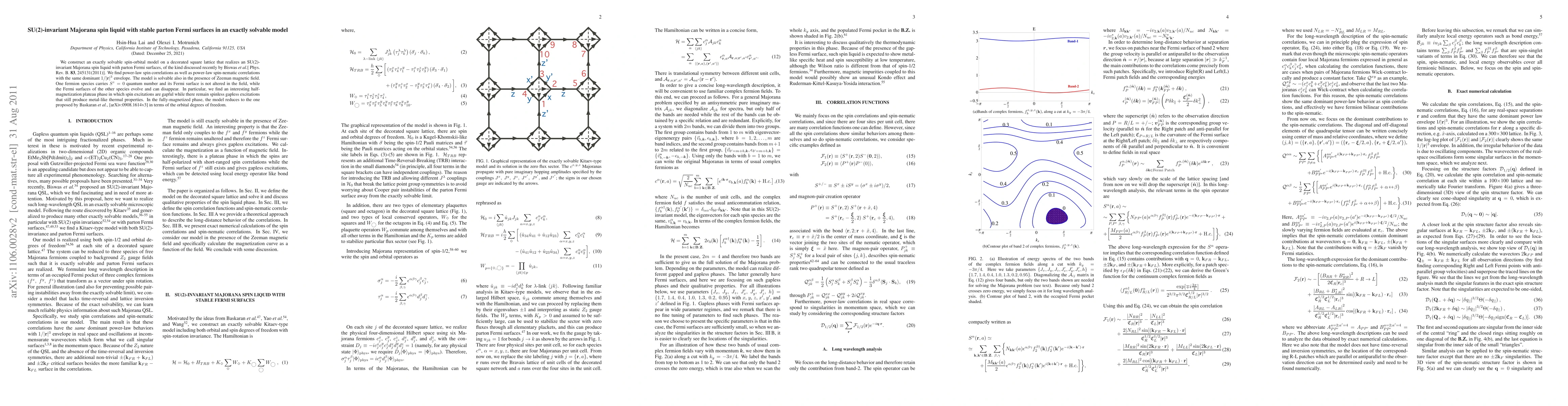 We construct an exactly solvable spin-orbital model on a decorated square lattice that realizes an SU(2)-invariant Majorana spin liquid with parton Fermi surfaces, of the kind discussed recently by Biswas et al. [ Phys. Rev. B. {\bf 83}, 245131(2011)]. We find power-law spin correlations as well as power-law spin-nematic correlations with the same dominant $1/|{\bf r}|^3$ envelope. The model is solvable also in the presence of Zeeman magnetic field. One fermion species carries $S^z=0$ quantum number and its Fermi surface is not altered in the field, while the Fermi surfaces of the other species evolve and can disappear. In particular, we find an interesting half-magnetization plateau phase in which spin excitations are gapful while there remain spinless gapless excitations that still produce metal-like thermal properties. In the fully-magnetized phase, the model reduces to the one proposed by Baskaran et al., [arXiv:0908.1614v3] in terms of the orbital degrees of freedom.