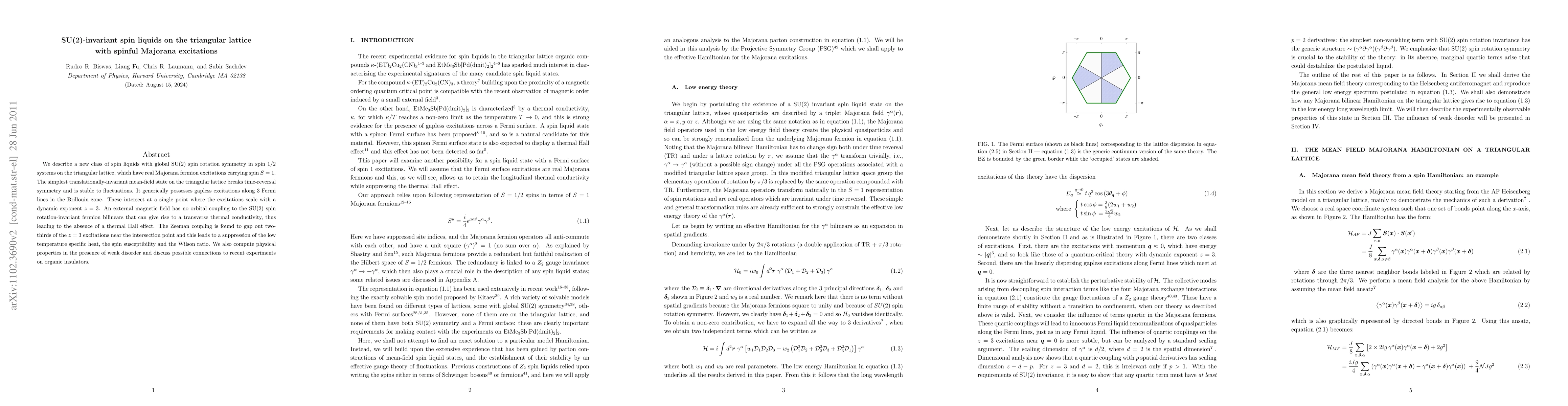We describe a new class of spin liquids with global SU(2) spin rotation symmetry in spin 1/2 systems on the triangular lattice, which have real Majorana fermion excitations carrying spin S = 1. The simplest translationally-invariant mean-field state on the triangular lattice breaks time-reversal symmetry and is stable to fluctuations. It generically possesses gapless excitations along 3 Fermi lines in the Brillouin zone. These intersect at a single point where the excitations scale with a dynamic exponent z = 3. An external magnetic field has no orbital coupling to the SU(2) spin rotation-invariant fermion bilinears that can give rise to a transverse thermal conductivity, thus leading to the absence of a thermal Hall effect. The Zeeman coupling is found to gap out two-thirds of the z = 3 excitations near the intersection point and this leads to a suppression of the low temperature specific heat, the spin susceptibility and the Wilson ratio. We also compute physical properties in the presence of weak disorder and discuss possible connections to recent experiments on organic insulators.