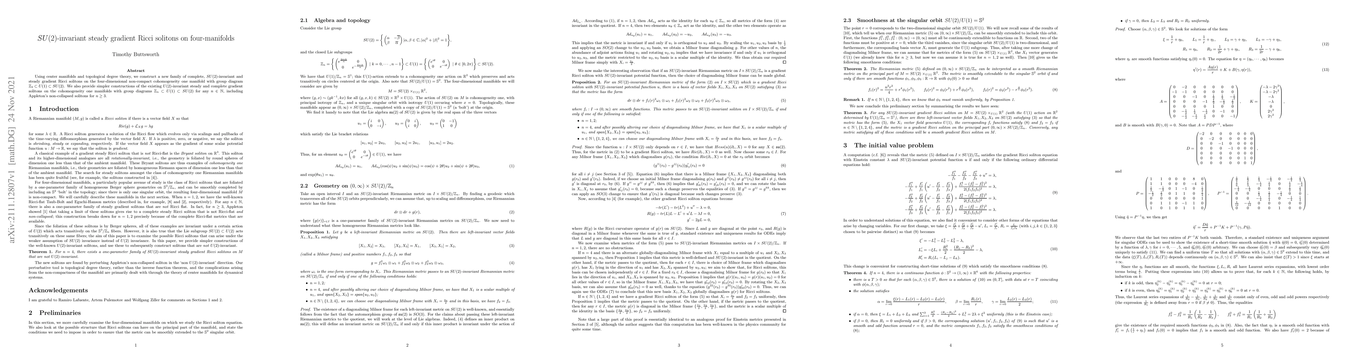 Using center manifolds and topological degree theory, we construct a new family of complete, $SU(2)$-invariant and steady gradient Ricci solitons on the four-dimensional non-compact cohomogeneity one manifold with group diagram $\mathbb{Z}_4\subset U(1)\subset SU(2)$. We also provide simpler constructions of the existing $U(2)$-invariant steady and complete gradient solitons on the cohomogeneity one manifolds with group diagrams $\mathbb{Z}_n\subset U(1)\subset SU(2)$ for any $n\in \mathbb{N}$, including Appleton's non-collapsed solitons for $n\ge 3$.