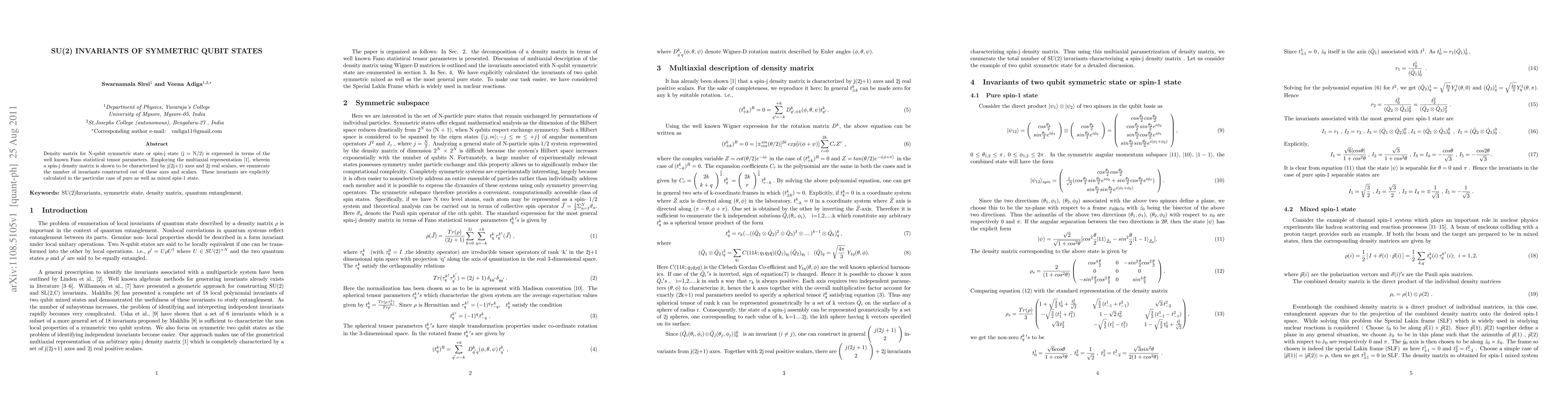 Density matrix for N-qubit symmetric state or spin-j state (j = N/2) is expressed in terms of the well known Fano statistical tensor parameters. Employing the multiaxial representation [1], wherein a spin-j density matrix is shown to be characterized by j(2j+1) axes and 2j real scalars, we enumerate the number of invariants constructed out of these axes and scalars. These invariants are explicitly calculated in the particular case of pure as well as mixed spin-1 state.