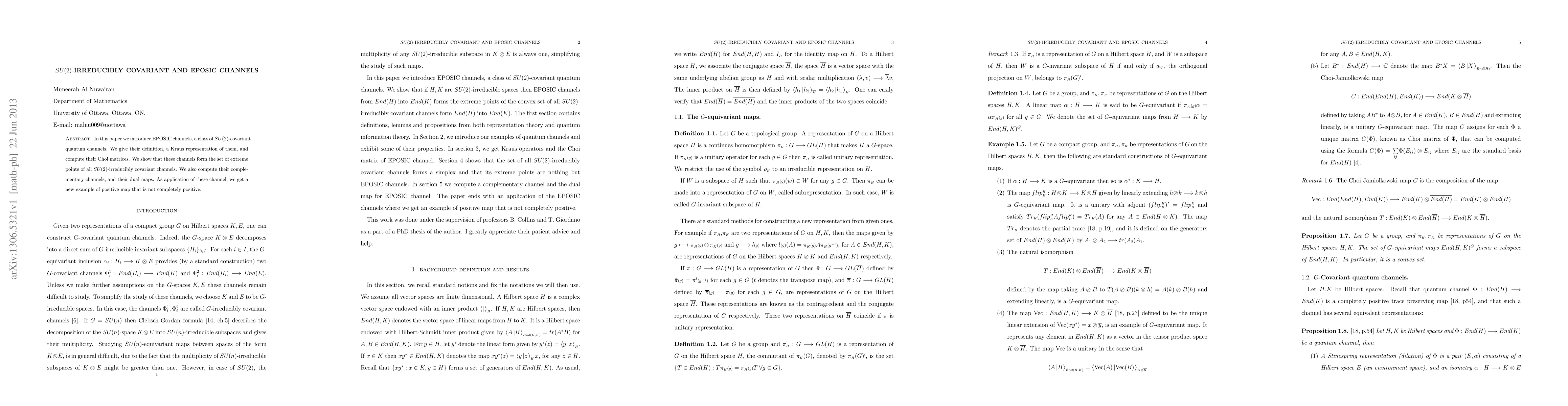 In this paper we introduce EPOSIC channels, a class of SU(2)-covariant quantum channels. We give their definition, a Kraus representation of them, and compute their Choi matrices. We show that these channels form the set of extreme points of all SU(2)-irreducibly covariant channels. We also compute their complementary channels, and their dual maps. As application of these channel, we get a new example of positive map that is not completely positive.