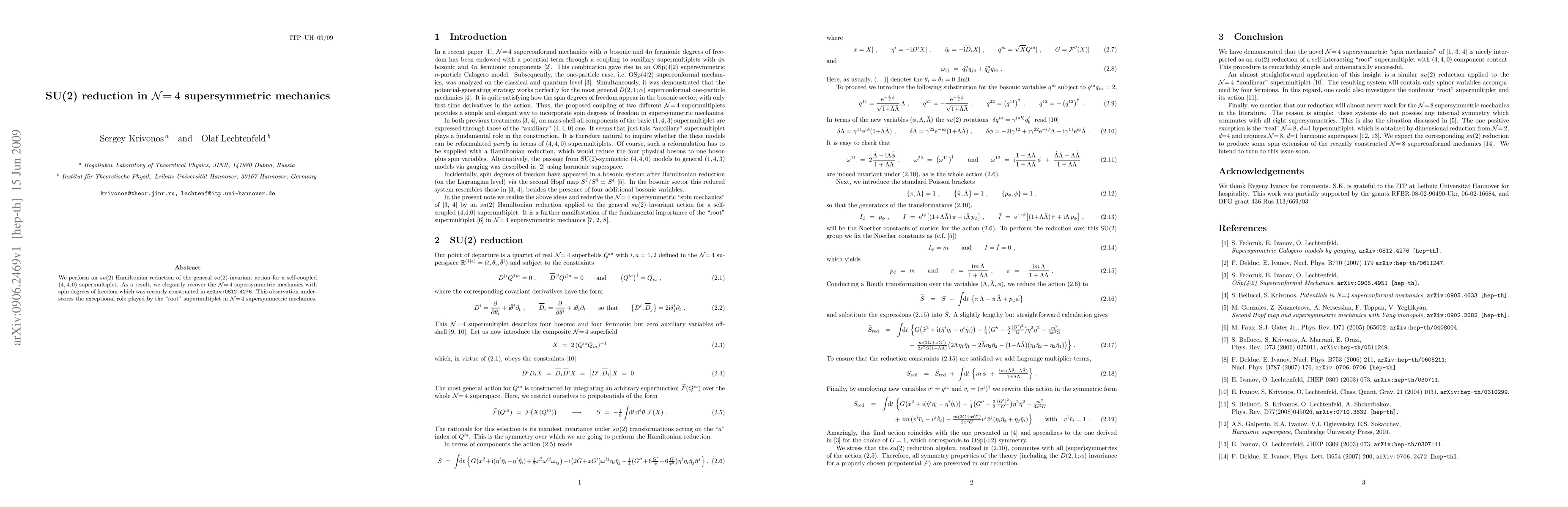 This research paper performs an SU(2) Hamiltonian reduction of a general SU(2)-invariant action for a self-coupled supermultiplet, successfully deriving N=4 supersymmetric mechanics with spin degrees of freedom, reaffirming the central role of the "root" supermultiplet in this framework.