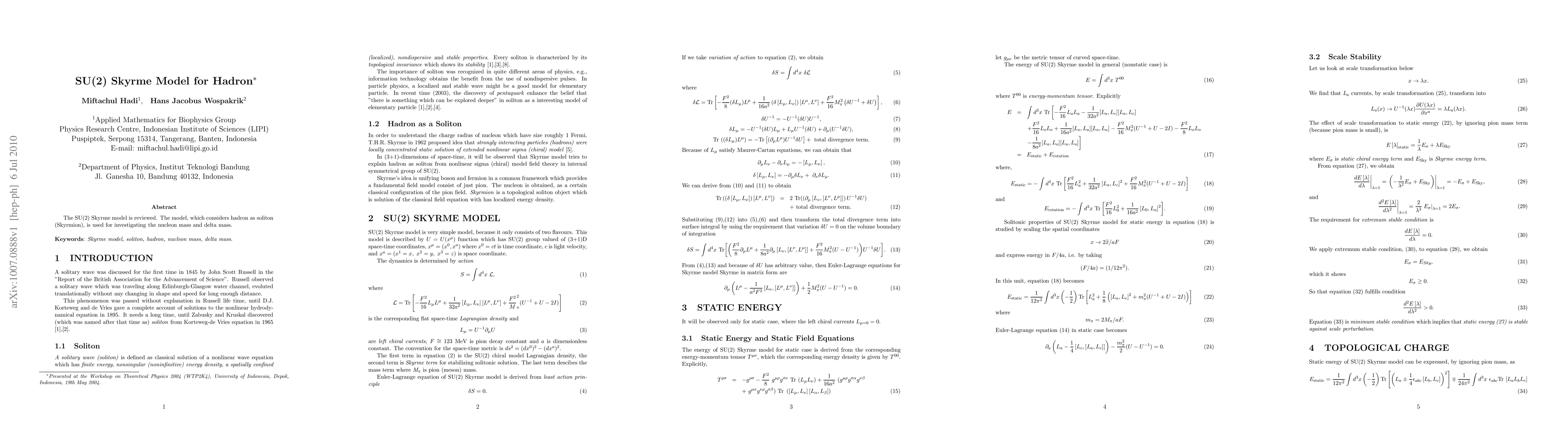The SU(2) Skyrme model is reviewed. The model, which considers hadron as soliton (Skyrmion), is used for investigating the nucleon mass and delta mass. Keywords: Skyrme model, soliton, hadron, nucleon mass, delta mass.