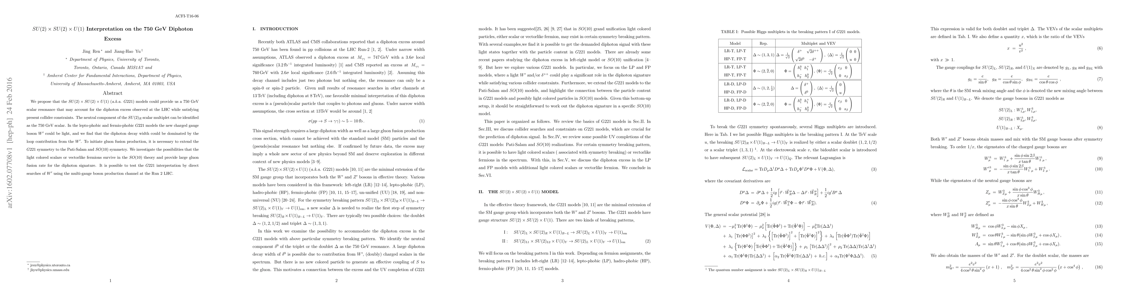 We propose that the SU(2) x SU(2) x U(1) (aka G221) models could provide us a 750 GeV scalar resonance that may account for the diphoton excess observed at the LHC while satisfying present collider constraints. The neutral component of the $SU(2)_R$ scalar multiplet can be identified as the 750 GeV scalar. In the lepto-phobic and fermio-phobic G221 models the new charged gauge boson W' could be light, and we find that the diphoton decay width could be dominated by the loop contribution from the $W'$. To initiate gluon fusion production, it is necessary to extend the G221 symmetry to the Pati-Salam and SO(10) symmetry. We investigate the possibilities that the light colored scalars or vectorlike fermions survive in the SO(10) theory and provide large gluon fusion rate for the diphoton signature. It is possible to test the G221 interpretation by direct searches of W' using the multi-gauge boson production channel at the Run 2 LHC.