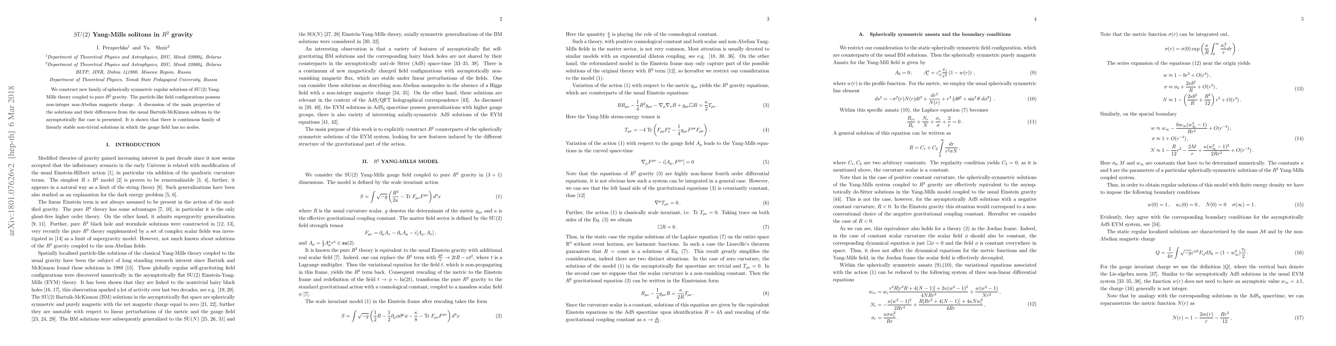 Researchers discovered a new family of spherically symmetric solutions to $SU(2)$ Yang-Mills theory coupled with $R^2$ gravity, featuring non-integer magnetic charge and linearly stable, node-free gauge fields.