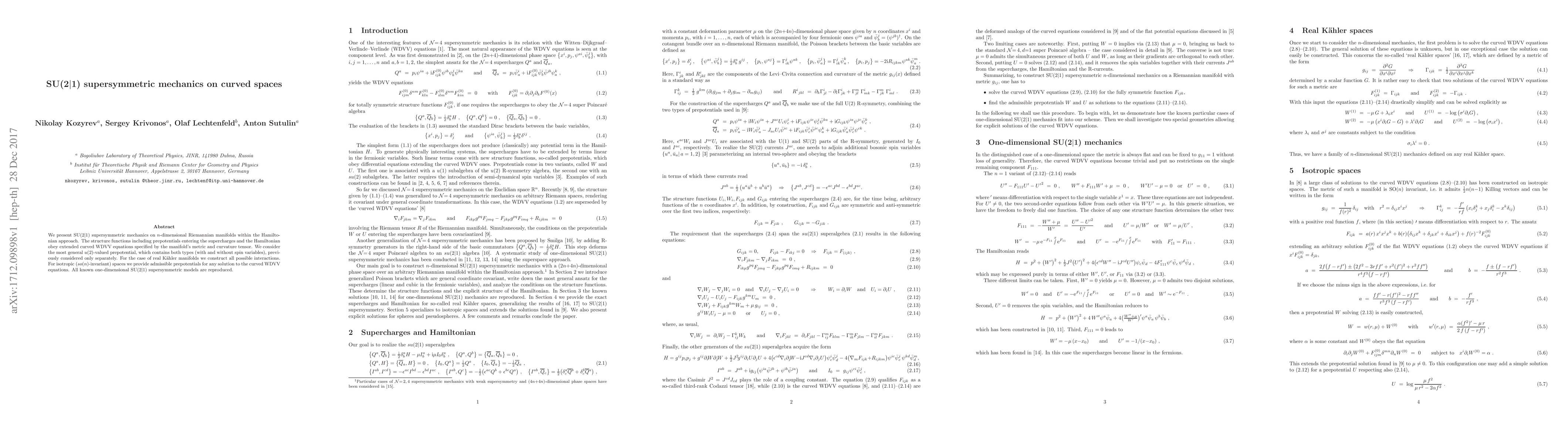 This paper develops SU(2|1) supersymmetric mechanics on n-dimensional Riemannian manifolds, focusing on Hamiltonian approaches and curved spaces. It incorporates general u(2)-valued prepotentials and constructs interactions for real Kähler and isotropic spaces, confirming all known one-dimensional models.