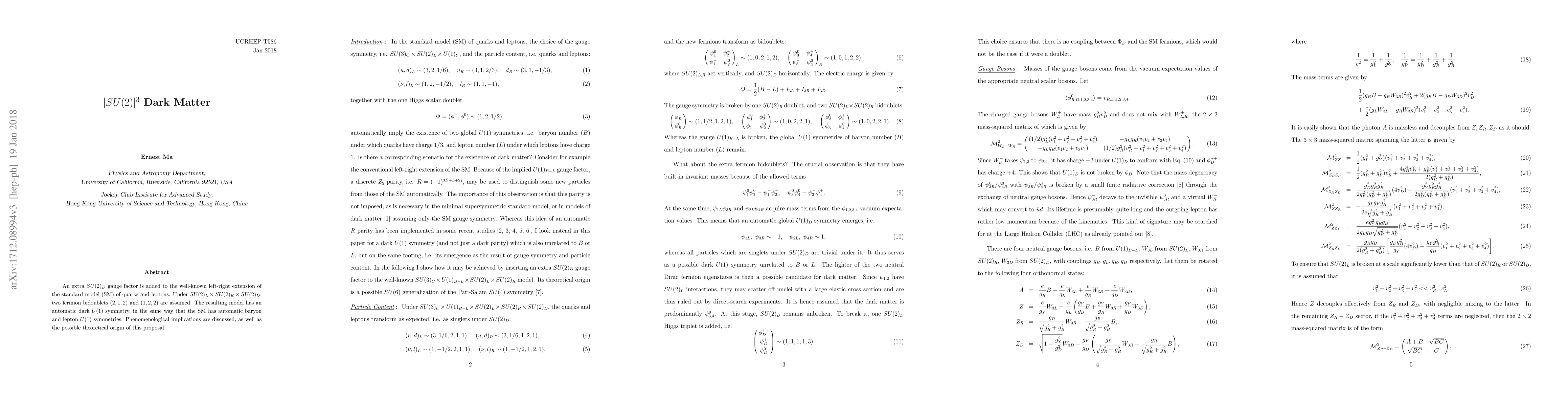 An extra $SU(2)_D$ gauge factor is added to the well-known left-right extension of the standard model (SM) of quarks and leptons. Under $SU(2)_L \times SU(2)_R \times SU(2)_D$, two fermion bidoublets $(2,1,2)$ and $(1,2,2)$ are assumed. The resulting model has an automatic dark $U(1)$ symmetry, in the same way that the SM has automatic baryon and lepton $U(1)$ symmetries. Phenomenological implications are discussed, as well as the possible origin of this proposal.
