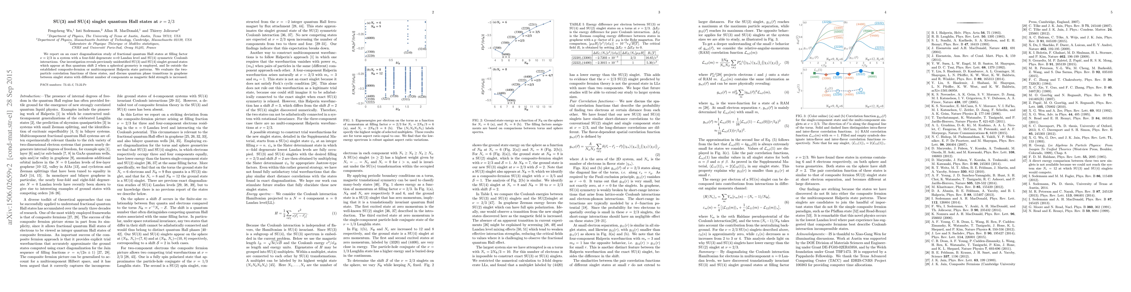 We report on an exact diagonalization study of fractional quantum Hall states at filling factor $\nu=2/3$ in a system with a four-fold degenerate $n$=0 Landau level and SU(4) symmetric Coulomb interactions. Our investigation reveals previously unidentified SU(3) and SU(4) singlet ground states which appear at flux quantum shift 2 when a spherical geometry is employed, and lie outside the established composite-fermion or multicomponent Halperin state patterns. We evaluate the two-particle correlation functions of these states, and discuss quantum phase transitions in graphene between singlet states with different number of components as magnetic field strength is increased.