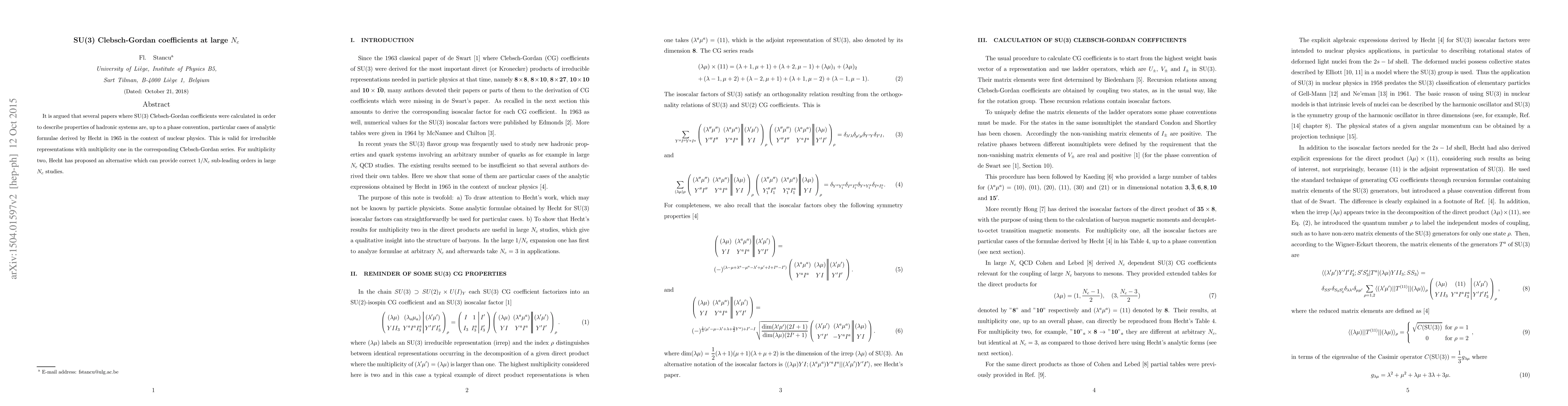 This paper demonstrates that earlier calculations of SU(3) Clebsch-Gordan coefficients in hadronic systems align with Hecht's 1965 analytic formulae, except for representations with multiplicity two where Hecht proposed an alternative approach to capture $1/N_c$ sub-leading orders in large $N_c$ studies.