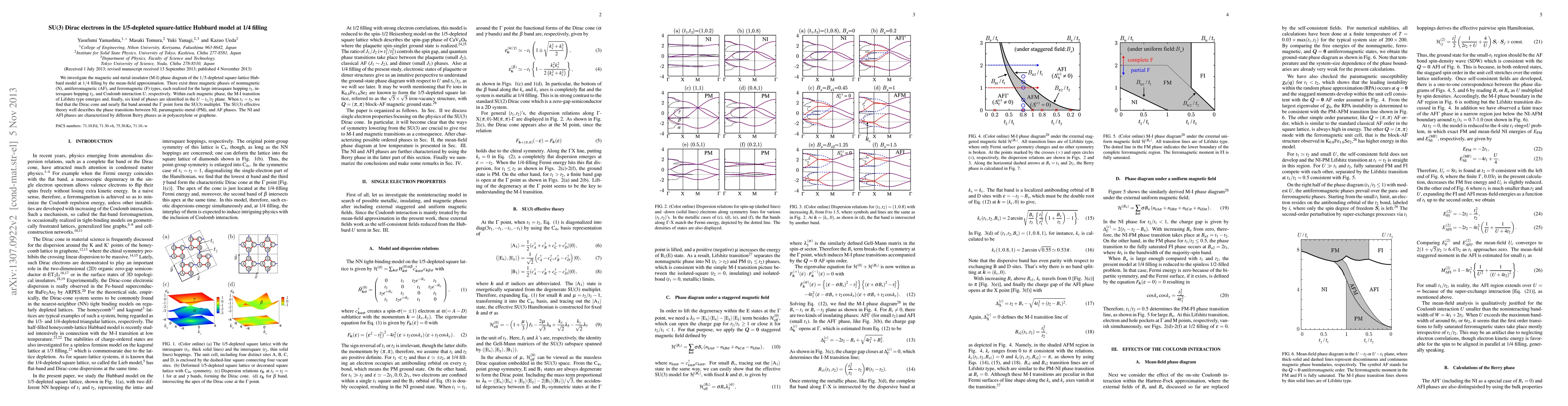 We investigate the magnetic and metal-insulator (M-I) phase diagram of the 1/5-depleted square-lattice Hubbard model at 1/4 filling by the mean-field approximation. There exist three magnetic phases of nonmagnetic (N), antiferromagnetic (AF), and ferromagnetic (F) types, each realized for the large intrasquare hopping t1, intersquare hopping t2, and Coulomb interaction U, respectively. Within each magnetic phase, the M-I transition of Lifshitz type emerges and, finally, six kind of phases are identified in the U-t1/t2 plane. When t1=t2, we find that the Dirac cone and nearly flat band around the Gamma point form the SU(3) multiplet. The SU(3) effective theory well describes the phase transitions between NI, paramagnetic-metal (PM), and AF phases. The NI and AFI phases are characterized by different Berry phases as in polyacetylene or graphene.