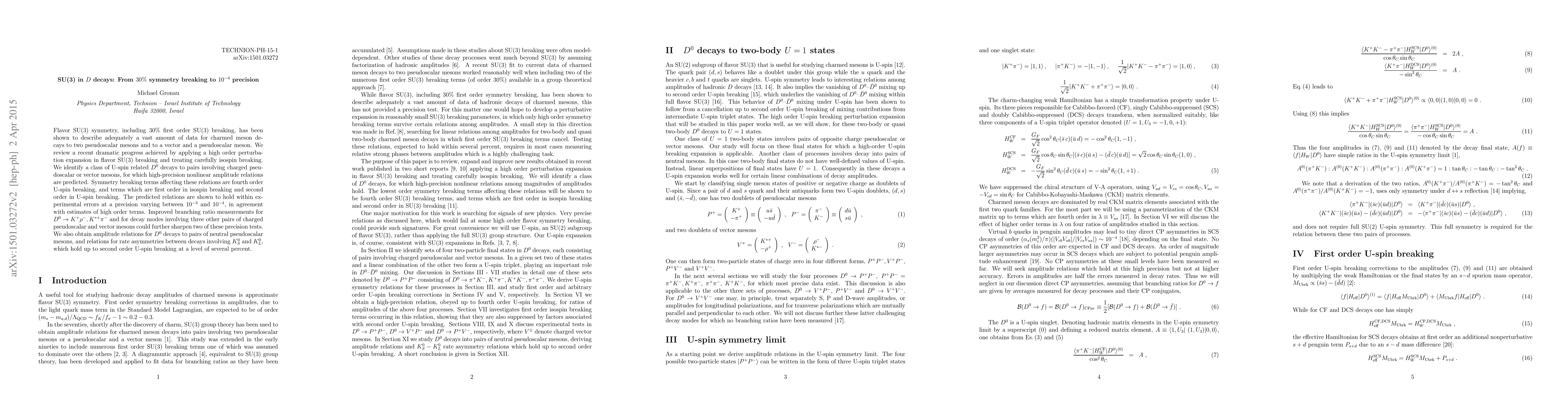 This paper reviews significant advancements in describing charmed meson decays using SU(3) flavor symmetry, achieving precision from $30\%$ symmetry breaking to $10^{-4}$. It predicts high-precision amplitude relations for specific $D^0$ decay processes, validated experimentally at remarkable accuracy.