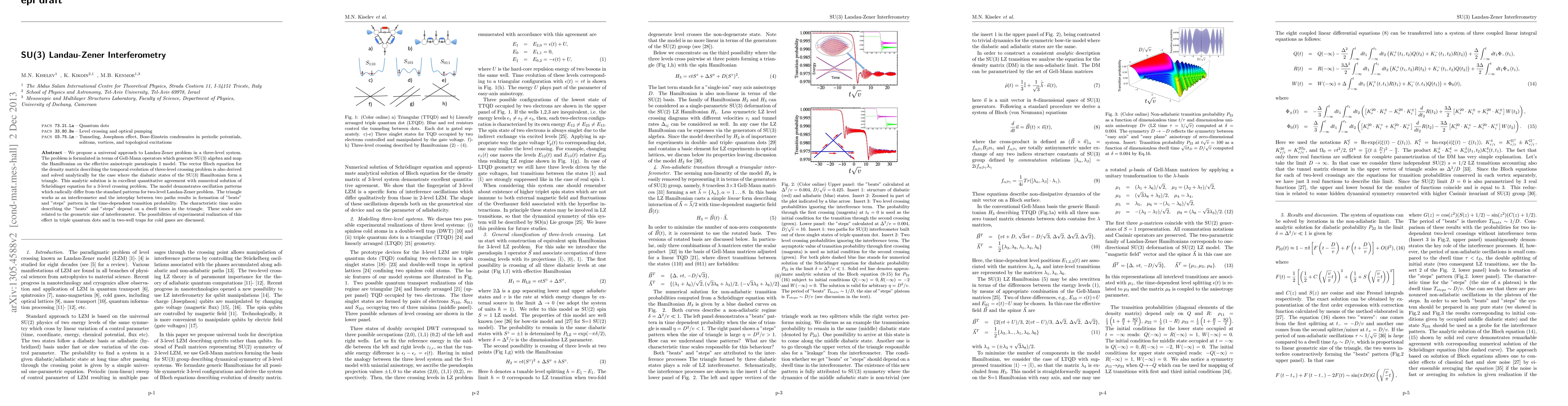 We consider a general theory of Landau-Zener transitions in a three-level system. Based on a classification of three level crossings we express the Landau - Zener Hamiltonians in terms of two bases: i) spin S=1 SU(2) operators and ii) SU(3) Gell - Mann matrices. We show that the generic Hamiltonians being non-linear in terms of the SU(2) group generators become linear in the SU(3) basis. If the diabatic states of the SU(3) Landau - Zener Hamiltonian form a triangle, the interference between two paths results in formation of "beats" and "steps" pattern in the time-dependent transition probability. The characteristic time scales describing the "beats" and "steps" depend on a dwell time through the triangle. These scales are related to the geometric size of the interferometer. We formulate the SU(3) Landau - Zener problem in terms of Bloch dynamics of a unit vector and find a solution of eight-dimensional Bloch equations in the limit of a non-adiabatic transition. Possible experiments in triangular and linearly arranged triple quantum dots where Landau - Zener interferometry can be used for finding manifestations of SU(3) symmetry are discussed.