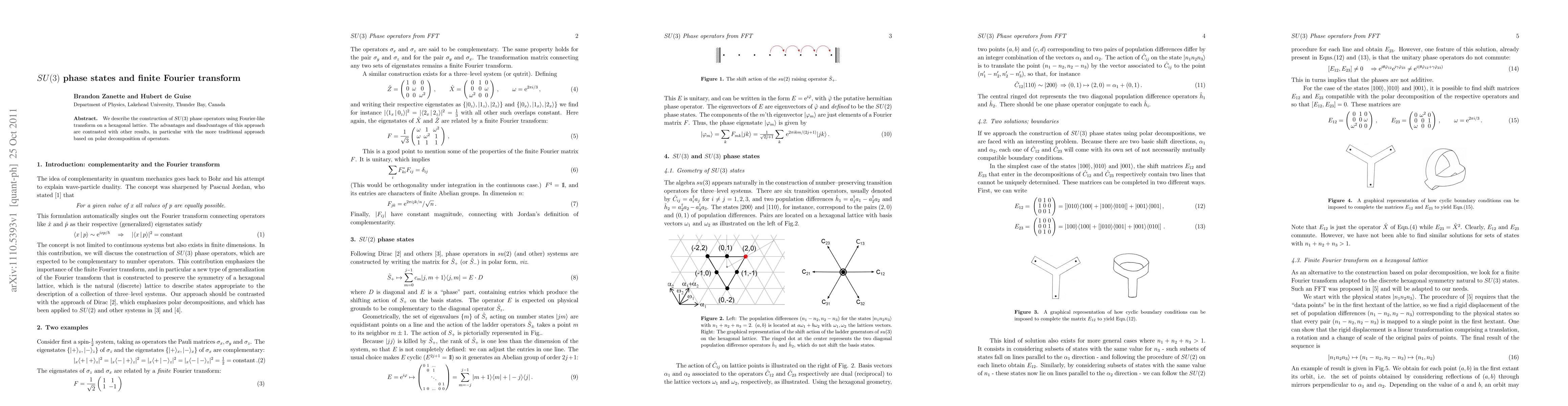 We describe the construction of SU(3) phase operators using Fourier-like transform on a hexagonal lattice. The advantages and disadvantages of this approach are contrasted with other results, in particular with the more traditional approach based on polar decomposition of operators.