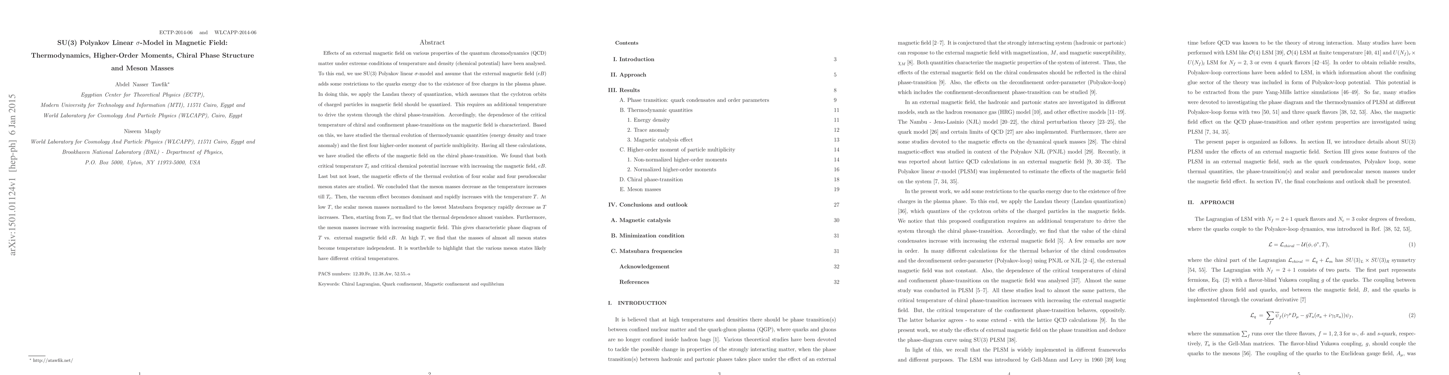 Effects of external magnetic field on various properties of the quantum chromodynamics under extreme conditions of temperature and density have been analysed. To this end, we use SU(3) Polyakov linear sigma-model and assume that the external magnetic field eB adds some restrictions to the quarks energy due to the existence of free charges in the plasma phase. In doing this, we apply the Landau theory of quantization. This requires an additional temperature to drive the system through the chiral phase-transition. Accordingly, the dependence of the critical temperature of chiral and confinement phase-transitions on the magnetic field is characterized. Based on this, we have studied the thermal evolution of thermodynamic quantities and the first four higher-order moment of particle multiplicity. Having all these calculations, we have studied the effects of magnetic field on chiral phase-transition. We found that both critical temperature T_c and critical chemical potential increase with increasing the magnetic field eB. Last but not least, the magnetic effects of the thermal evolution of four scalar and four pseudoscalar meson states are studied. We concluded that the meson masses decrease as the temperature increases till T_c. Then, the vacuum effect becomes dominant and rapidly increases with the temperature T. At low T, the scalar meson masses normalized to the lowest Matsubara frequency rapidly decreases as T increases. Then, starting from T_c, we find that the thermal dependence almost vanishes. Furthermore, the meson masses increase with increasing magnetic field. This gives characteristic phase diagram of T vs. external magnetic field $B. At high T, we find that the masses of almost all meson states become temperature independent. It is concluded that the various meson states likely have different T_c's.