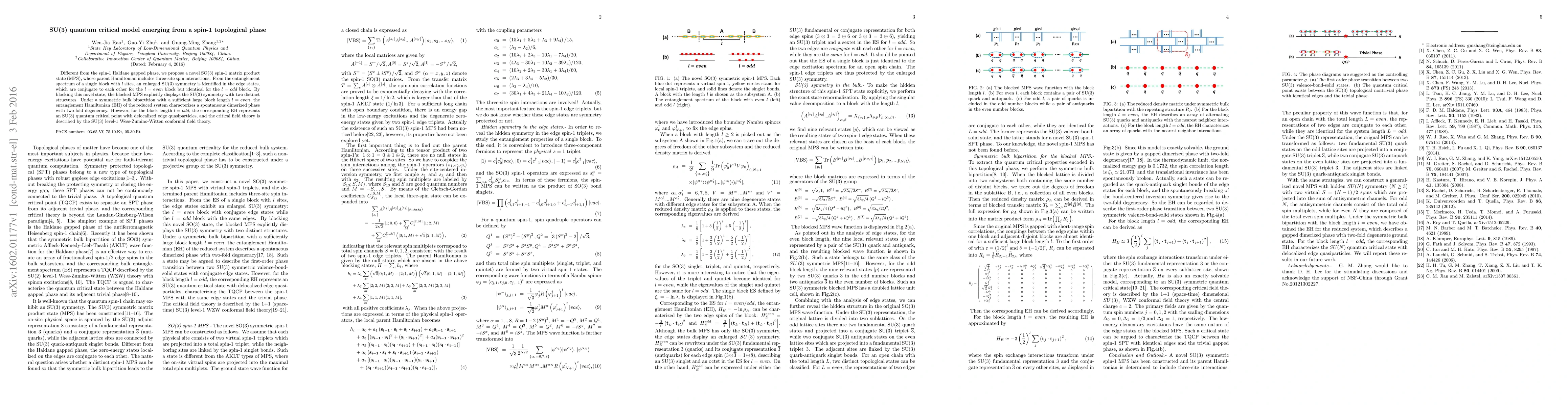 Researchers discovered a novel SU(3) quantum critical model emerging from a spin-1 topological phase, with distinct behaviors depending on the block length of a matrix product state.
