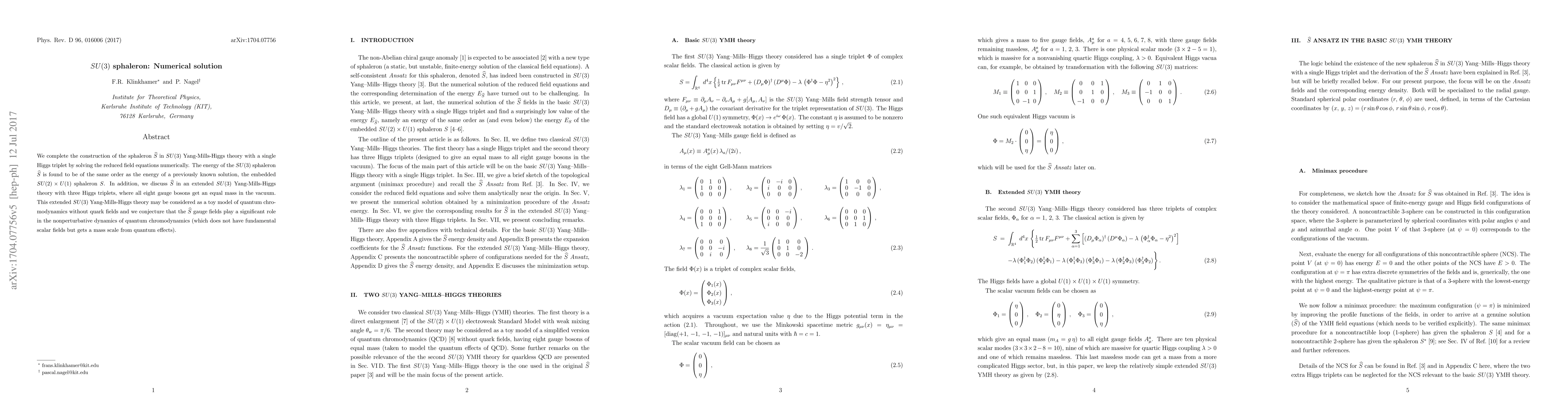 We complete the construction of the sphaleron $\widehat{S}$ in $SU(3)$ Yang-Mills-Higgs theory with a single Higgs triplet by solving the reduced field equations numerically. The energy of the $SU(3)$ sphaleron $\widehat{S}$ is found to be of the same order as the energy of a previously known solution, the embedded $SU(2)\times U(1)$ sphaleron $S$. In addition, we discuss $\widehat{S}$ in an extended $SU(3)$ Yang-Mills-Higgs theory with three Higgs triplets, where all eight gauge bosons get an equal mass in the vacuum. This extended $SU(3)$ Yang-Mills-Higgs theory may be considered as a toy model of quantum chromodynamics without quark fields and we conjecture that the $\widehat{S}$ gauge fields play a significant role in the nonperturbative dynamics of quantum chromodynamics (which does not have fundamental scalar fields but gets a mass scale from quantum effects).