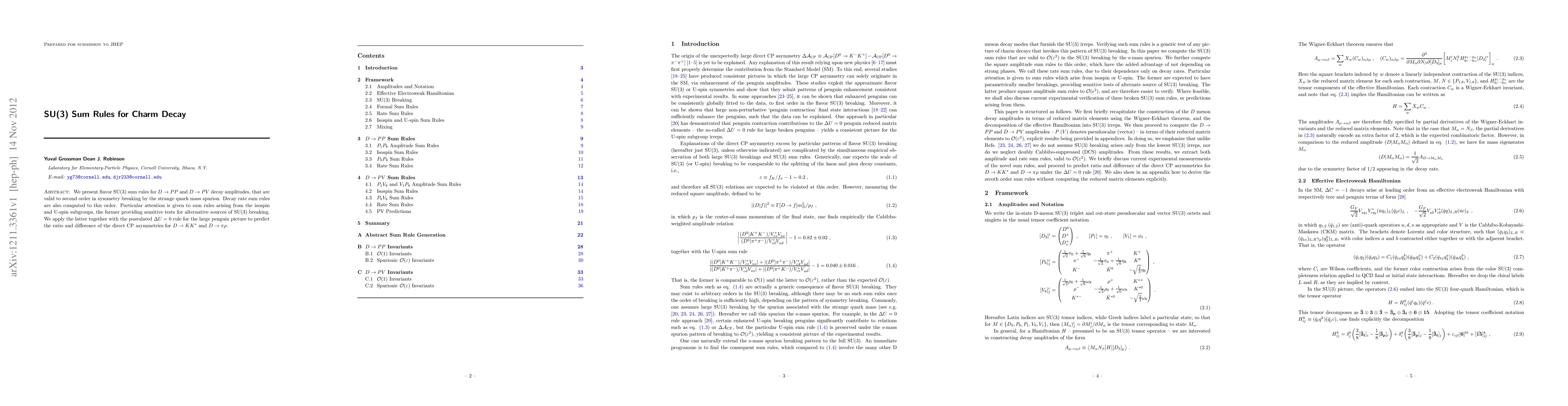 This paper develops flavor SU(3) sum rules for charm decay processes $D \to PP$ and $D \to PV$, focusing on second-order symmetry breaking effects. It highlights sum rules from isospin and U-spin subgroups to test SU(3) breaking sources and predicts CP asymmetry ratios for $D \to KK^*$ and $D \to \pi \rho$ using the $\Delta U = 0$ rule.