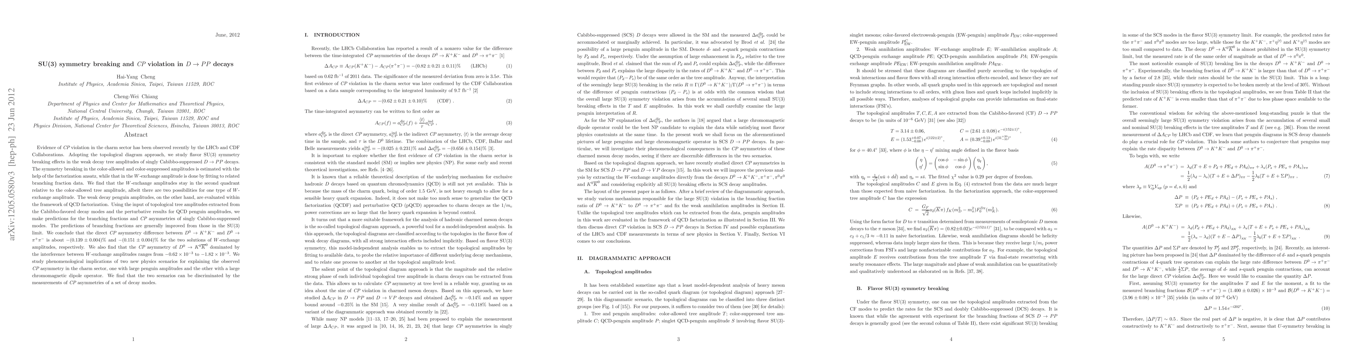 This paper investigates CP violation in charm meson decays ($D\to PP$) using SU(3) symmetry breaking and the topological diagram approach. It predicts improved branching fractions and CP asymmetries, finding a direct CP asymmetry difference of about $-(0.139\pm 0.004)%$ between $D^0 \to K^+ K^-$ and $D^0 \to \pi^+ \pi^-$, and explores new physics scenarios to explain observed CP asymmetries.