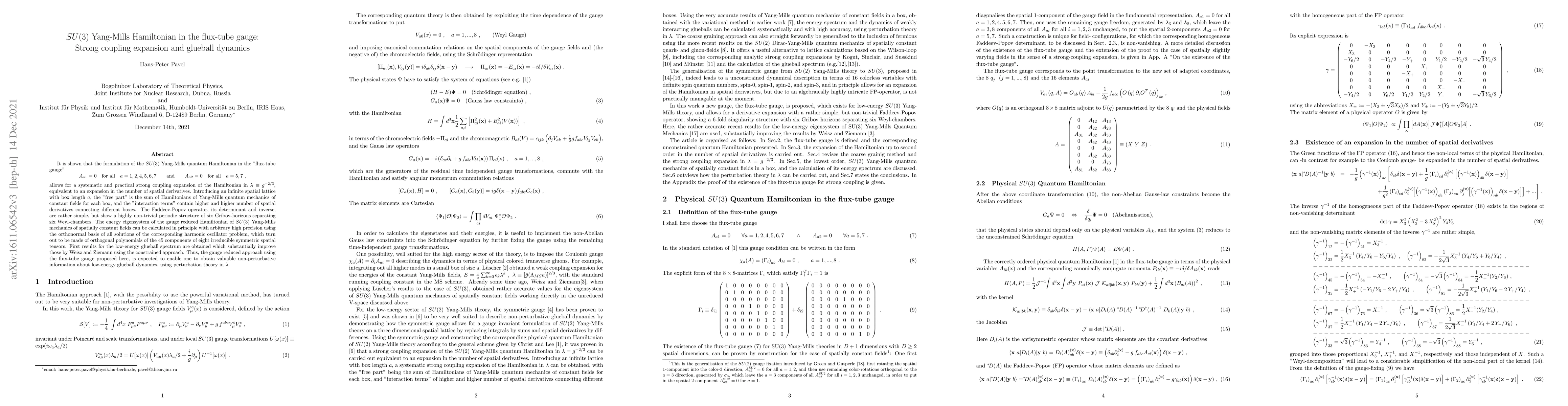 It is shown that the formulation of the SU(3) Yang-Mills quantum Hamiltonian in the "flux-tube gauge" $A_{a1}=0$ for all a=1,2,4,5,6,7 and $A_{a2}=0$ for all a=5,7 allows for a systematic and practical strong coupling expansion of the Hamiltonian in $\lambda\equiv g^{-2/3}$, equivalent to an expansion in the number of spatial derivatives. Introducing an infinite spatial lattice with box length a, the "free part" is the sum of Hamiltonians of Yang-Mills quantum mechanics of constant fields for each box, and the "interaction terms" contain higher and higher number of spatial derivatives connecting different boxes. The Faddeev-Popov operator, its determinant and inverse, are rather simple, but show a highly non-trivial periodic structure of six Gribov-horizons separating six Weyl-chambers. The energy eigensystem of the gauge reduced Hamiltonian of SU(3) Yang-Mills mechanics of spatially constant fields can be calculated in principle with arbitrary high precision using the orthonormal basis of all solutions of the corresponding harmonic oscillator problem, which turn out to be made of orthogonal polynomials of the 45 components of eight irreducible symmetric spatial tensors. First results for the low-energy glueball spectrum are obtained which substantially improve those by Weisz and Ziemann using the constrained approach. Thus, the gauge reduced approach using the flux-tube gauge proposed here, is expected to enable one to obtain valuable non-perturbative information about low-energy glueball dynamics, using perturbation theory in $\lambda$.