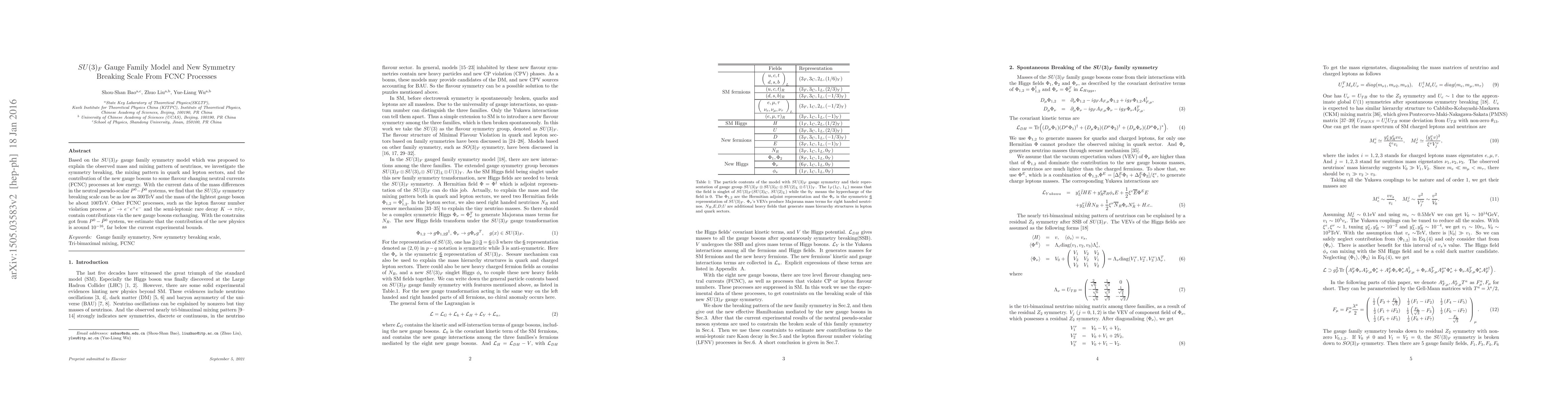 This paper explores the $SU(3)_{F}$ gauge family symmetry model to explain neutrino mass and mixing patterns, proposing a low symmetry breaking scale of 300TeV and a lightest gauge boson mass around 100TeV. It also examines contributions from new gauge bosons to FCNC processes, estimating new physics contributions below current experimental limits.