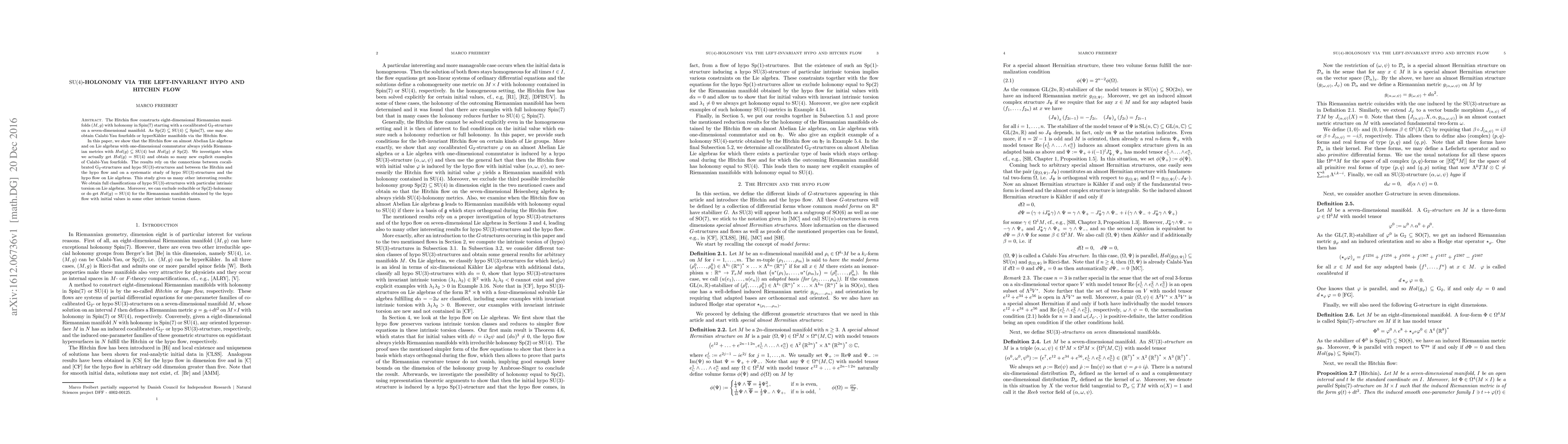 This paper demonstrates that the Hitchin flow on certain Lie algebras generates Riemannian metrics with holonomy contained in SU(4), but not Sp(2). It identifies conditions for SU(4)-holonomy, yielding new Calabi-Yau fourfold examples. The research connects cocalibrated G_2-structures and hypo SU(3)-structures, classifying the latter on Lie algebras and excluding reducible or Sp(2)-holonomy cases.
