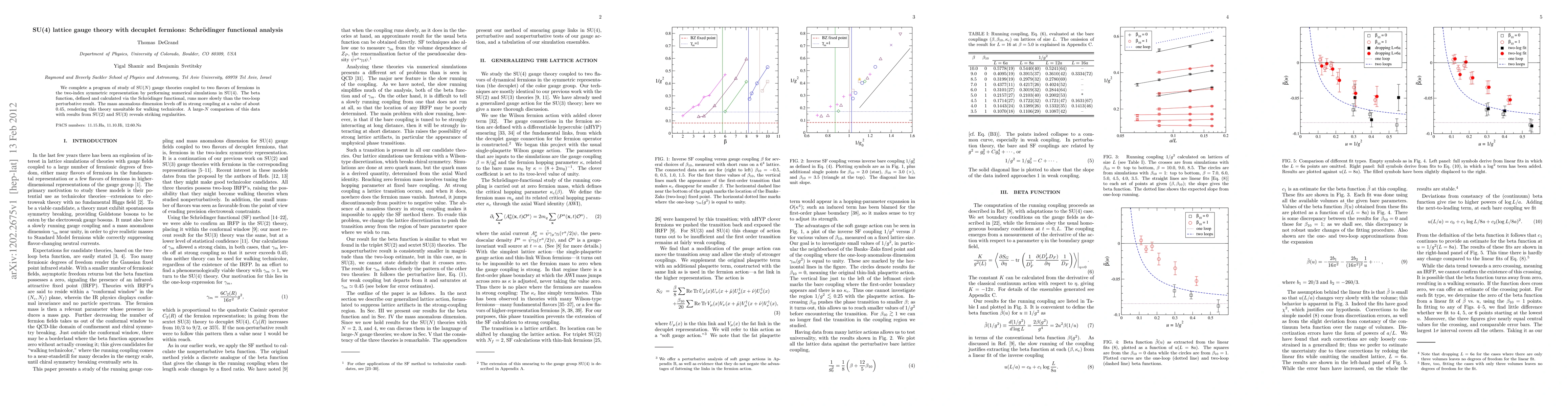 This paper presents numerical simulations of SU(4) lattice gauge theory with decuplet fermions, showing that the beta function runs slower than the two-loop perturbative result. The mass anomalous dimension stabilizes at around 0.45 in strong coupling, making this theory unsuitable for walking technicolor, and large-N comparisons reveal notable regularities with SU(2) and SU(3).