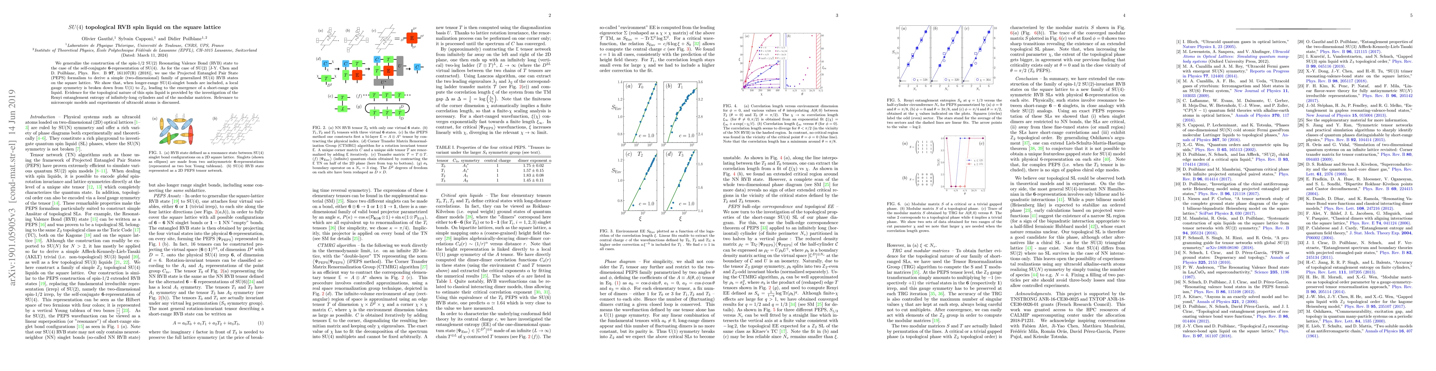 This paper constructs a generalized SU(4) Resonating Valence Bond (RVB) state on the square lattice using the Projected Entangled Pair State formalism, demonstrating a local gauge symmetry breakdown and the emergence of a topological spin liquid. Evidence for its topological nature is provided through Renyi entanglement entropy and modular matrices analysis.