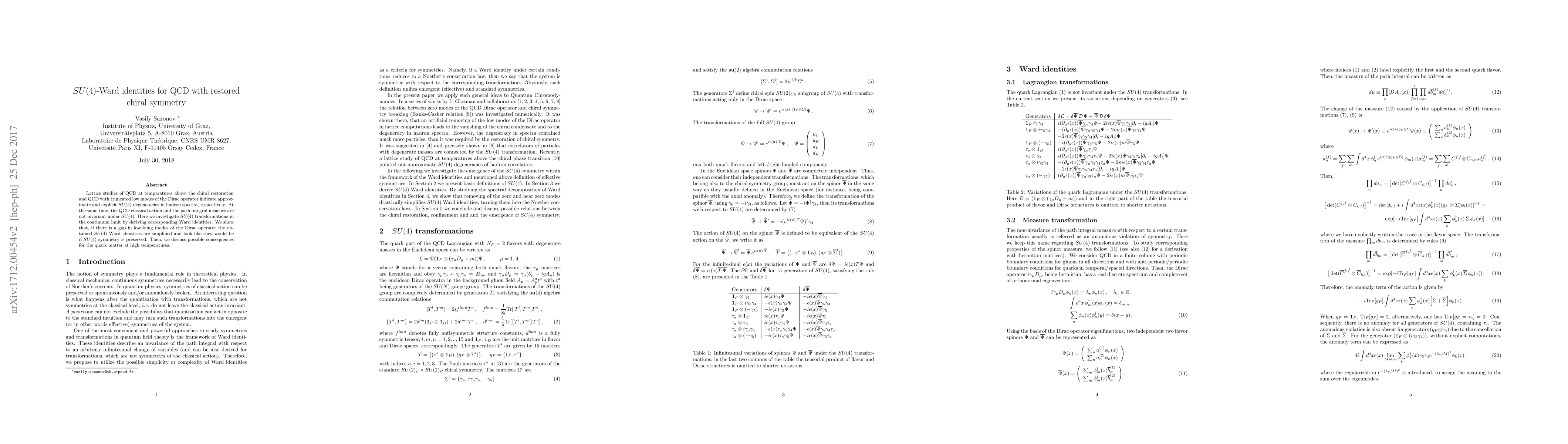 Lattice studies of QCD at temperatures above the chiral restoration and QCD with truncated low modes of the Dirac operator indicate approximate and explicit $SU(4)$ degeneracies in hadron spectra, respectively. At the same time, the QCD classical action and the path integral measure are not invariant under $SU(4)$. Here we investigate $SU(4)$ transformations in the continuum limit by deriving corresponding Ward identities. We show that, if there is a gap in low-lying modes of the Dirac operator the obtained $SU(4)$ Ward identities are simplified and look like they would be if $SU(4)$ symmetry is preserved. Then, we discuss possible consequences for the quark matter at high temperatures.