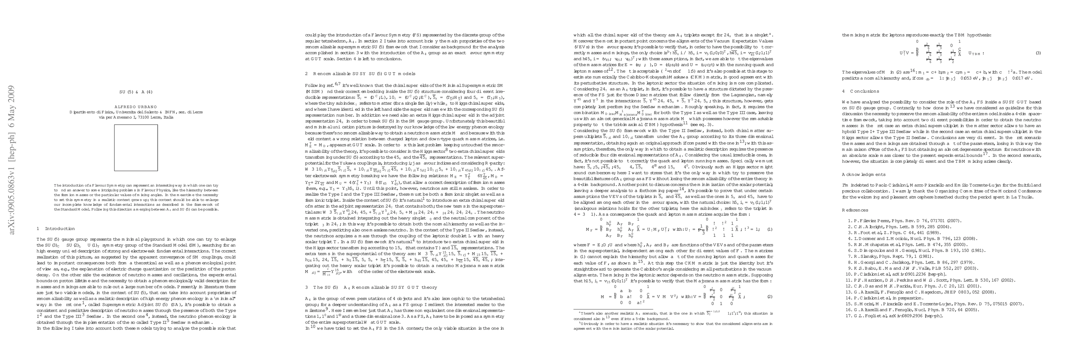 The introduction of a Flavour Symmetry can represent an interesting way in which one can try to find an answer to some intriguing problems in Flavour Physics, like the hierarchy between the fermion masses or the particular values of mixing angles. In the meantime the necessity to set this symmetry in a realistic context grows up; this context should be able to enlarge our incomplete knowledge of fundamental interactions as described in the framework of the Standard Model. Following this direction a merging between A(4) and SU(5) can be possible.