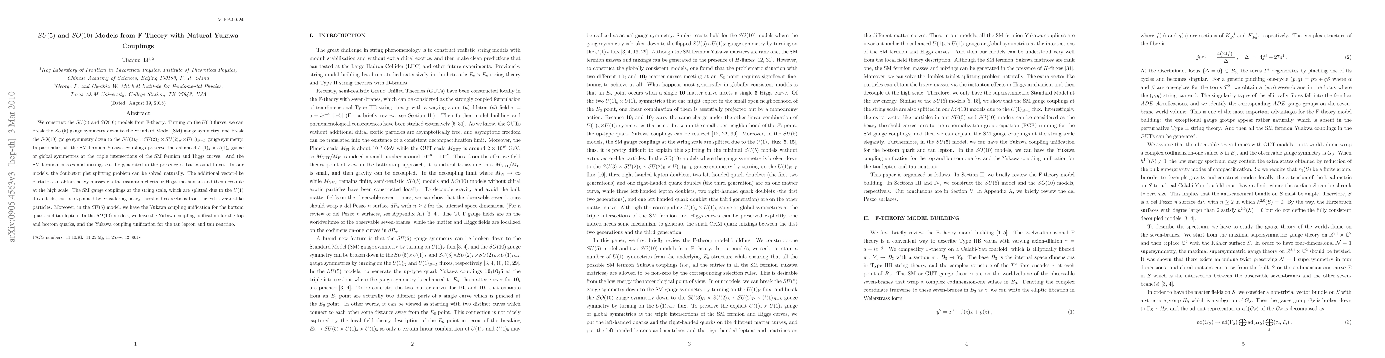 This paper constructs SU(5) and SO(10) models from F-theory, achieving gauge symmetry breaking to the Standard Model and enhanced symmetries preserving natural Yukawa couplings. The models naturally solve the doublet-triplet splitting problem and achieve Yukawa coupling unifications.