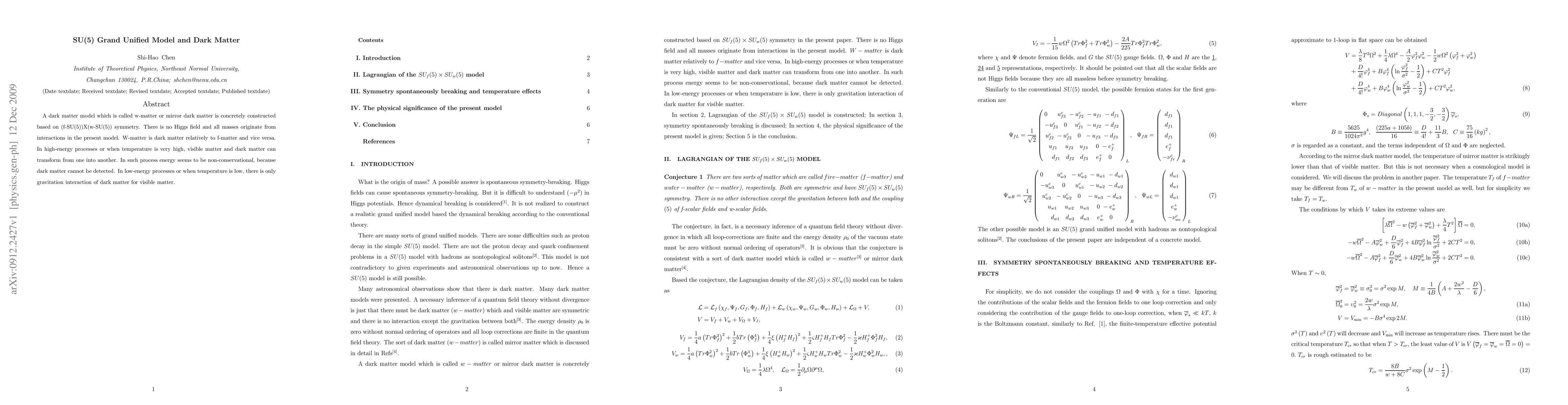 This paper constructs a dark matter model termed "w-matter" based on (f-SU(5))X(w-SU(5)) symmetry, where no Higgs field is used and all masses arise from interactions. W-matter transforms into visible matter under high-energy conditions, seemingly violating energy conservation due to its undetectable nature, while in low-energy scenarios, it interacts only gravitationally with visible matter.