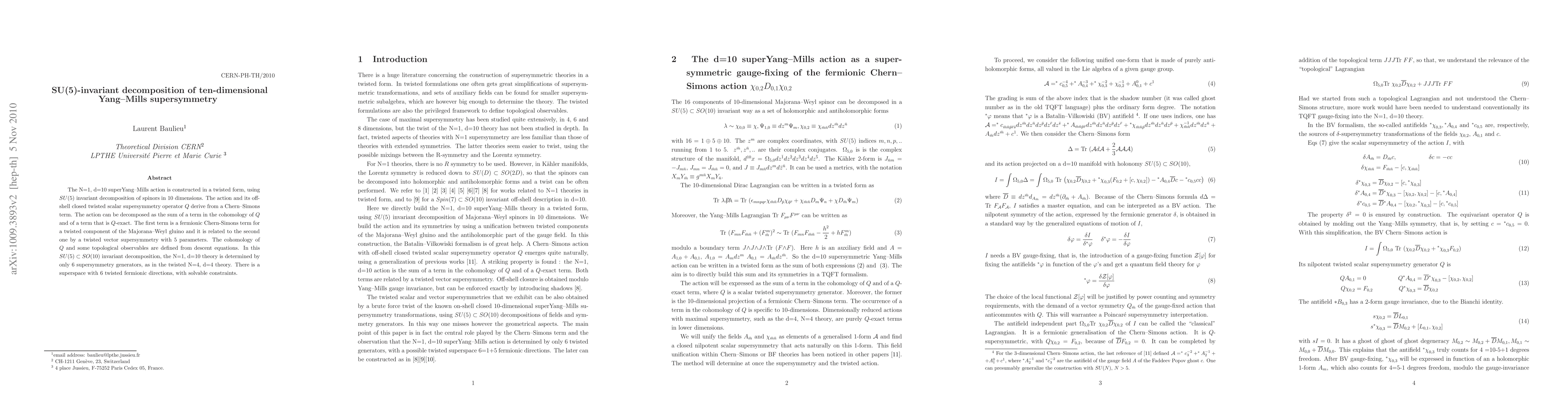 This paper presents a novel SU(5)-invariant decomposition of ten-dimensional N=1 super Yang-Mills, constructing its action using a twisted form and a Chern-Simons term. The action is decomposed into a cohomology term and a Q-exact term, with the former being a fermionic Chern-Simons term. This reduction results in only 6 supersymmetry generators, similar to the twisted N=4, d=4 theory, indicating a simplified structure in higher dimensions.