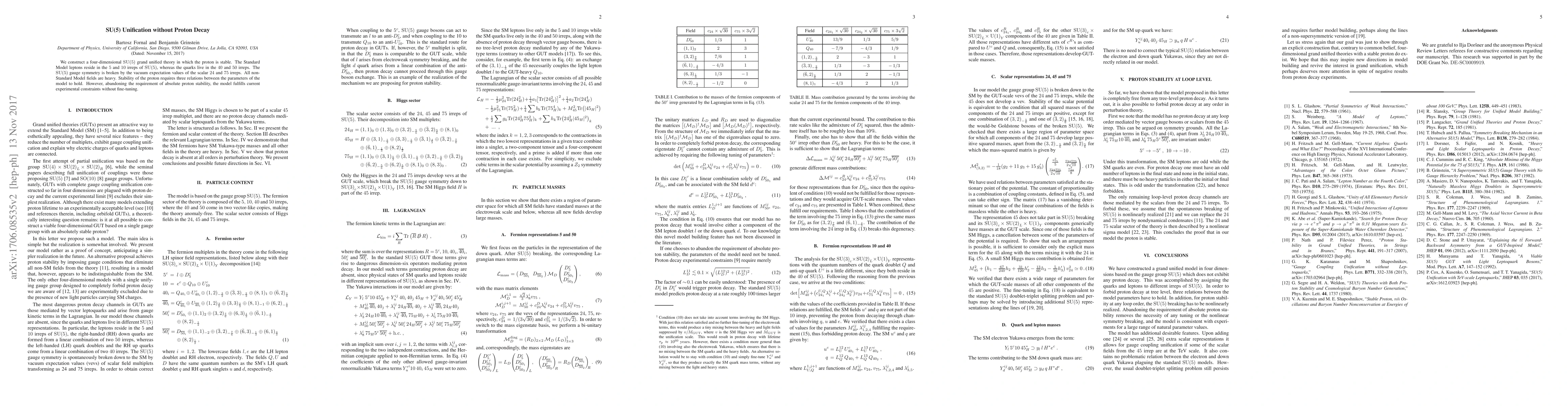 This paper proposes a four-dimensional SU(5) grand unified theory where the proton remains stable, with the Standard Model particles organized in specific SU(5) representations. The model achieves experimental compliance without fine-tuning, even if absolute proton stability is not strictly enforced.