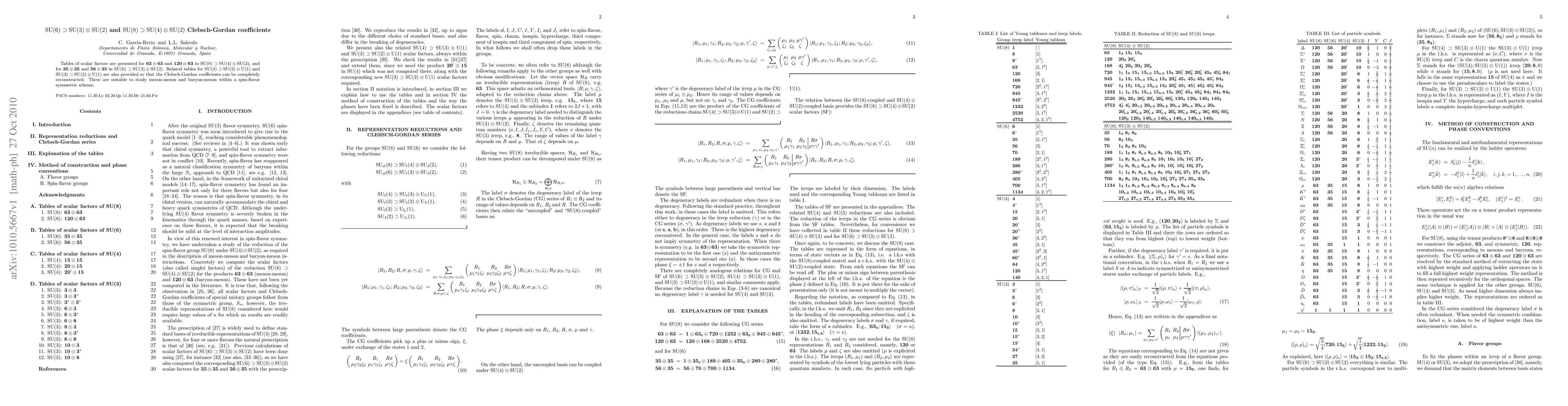 Tables of scalar factors are presented for 63x63 and 120x63 in SU(8)$\supset$SU(4)xSU(2), and for 35x35 and 56x35 in SU(6)$\supset$SU(3)xSU(2). Related tables for SU(4)$\supset$SU(3)xU(1) and SU(3)$\supset$SU(2)xU(1) are also provided so that the Clebsch-Gordan coefficients can be completely reconstructed. These are suitable to study meson-meson and baryon-meson within a spin-flavor symmetric scheme.