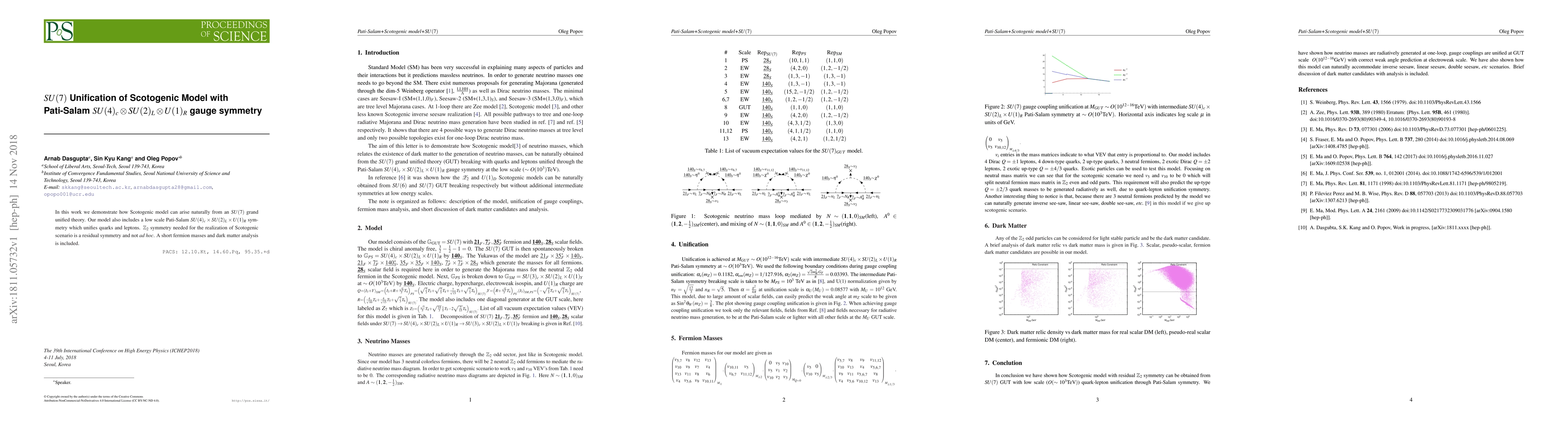 In this work we demonstrate how Scotogenic model can arise naturally from an $SU(7)$ grand unified theory. Our model also includes a low scale Pati-Salam $SU(4)_c\times SU(2)_L\times U(1)_R$ symmetry which unifies quarks and leptons. $\mathbb{Z}_2$ symmetry needed for the realization of Scotogenic scenario is a residual symmetry and not $ad$ $hoc$. A short fermion masses and dark matter analysis is included.