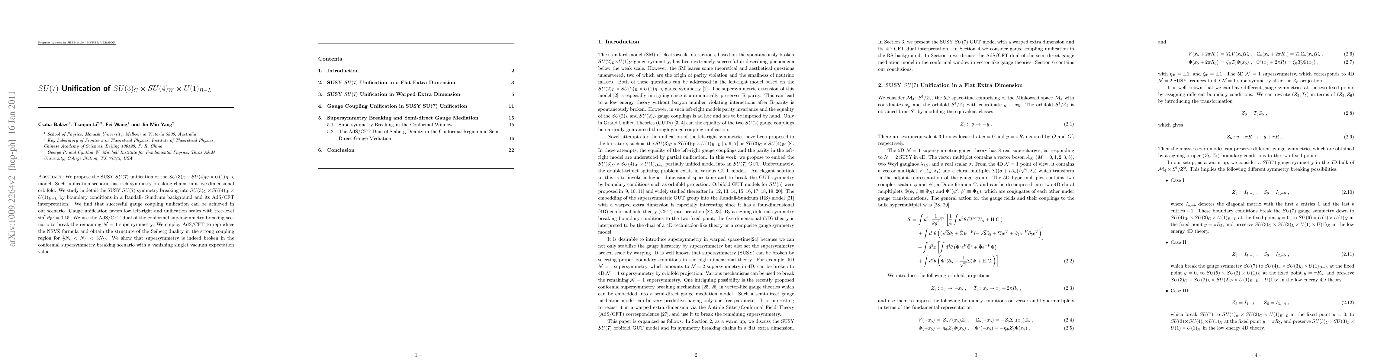 This paper proposes a SUSY SU(7) unification model for the gauge groups SU(3)_C, SU(4)_W, and U(1)_{B-L}, achieving gauge coupling unification in a five-dimensional orbifold framework. It utilizes AdS/CFT correspondence to break supersymmetry and detail the symmetry breaking down to the desired gauge structure.