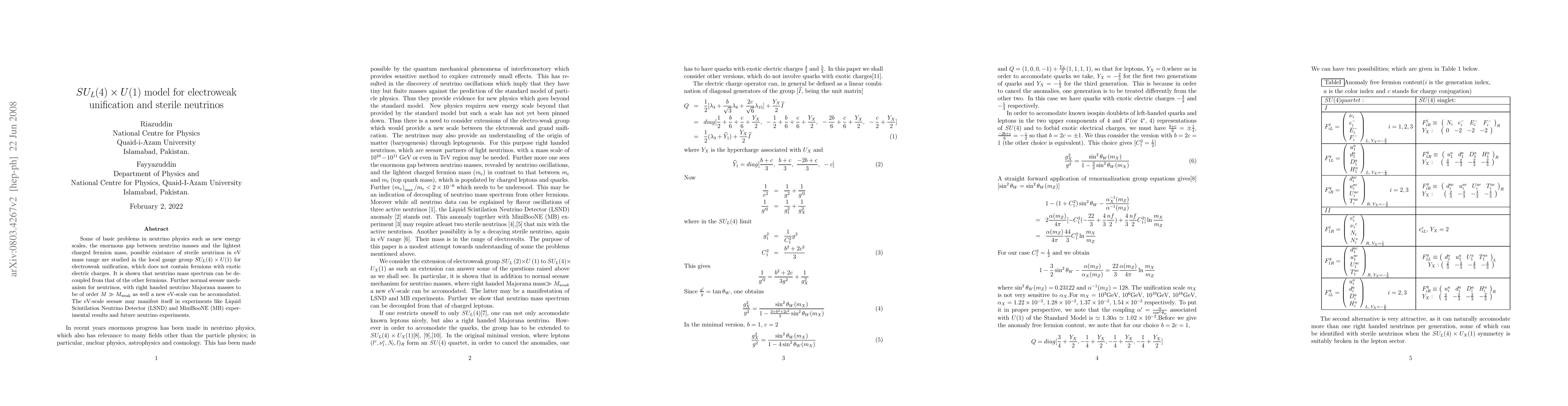 Researchers explore a $SU_{L}(4) imes U(1)$ model for electroweak unification and sterile neutrinos, proposing a new seesaw mechanism that could accommodate eV-scale neutrino masses and explain experimental results from LSND and MB.