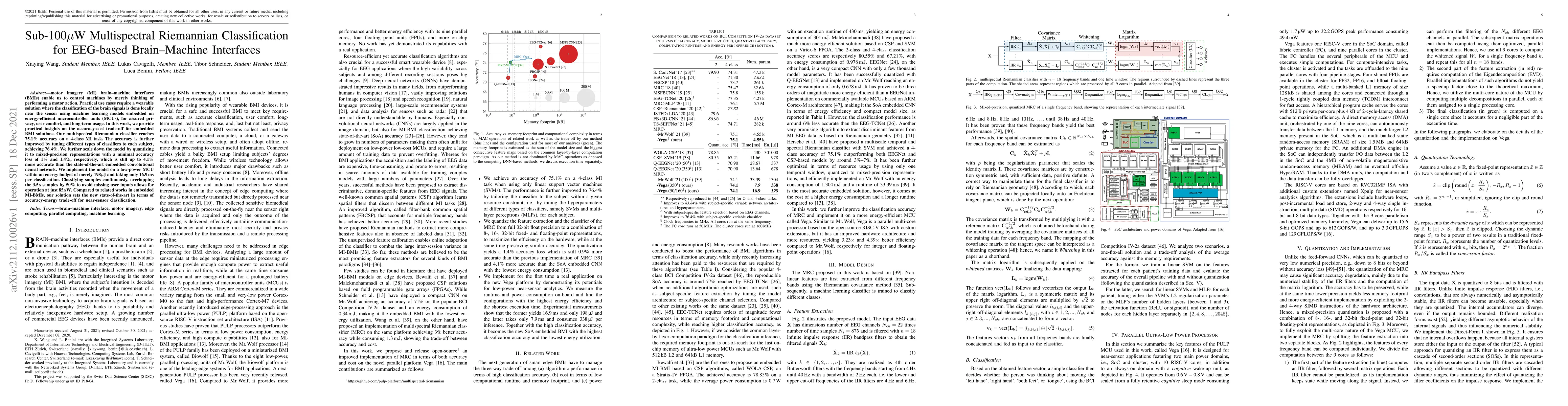 This research presents a low-power EEG-based brain-machine interface (BMI) achieving 76.4% accuracy in a 4-class motor imagery task, using a multispectral Riemannian classifier. The model is quantized to mixed-precision representations, reducing its size with minimal accuracy loss. Implemented on a low-power microcontroller unit, it consumes just 85uW, setting a new state-of-the-art in accuracy-energy trade-off for near-sensor classification in embedded MI-BMIs.